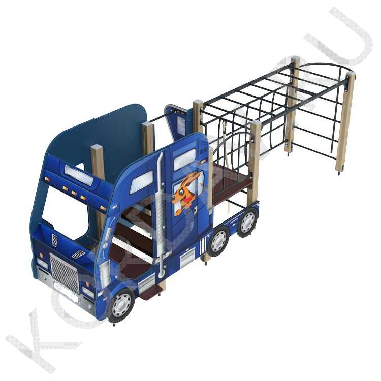 Детский комплекс Грузовик с горкой, шведской стенкой и рукоходом ПДИ 1.26 держится на 8-ми опорных столбах диаметром 89 мм, которые тщательно обработаны и окрашены защитной от коррозии краской. Сверху столбы закрыты пластиковыми заглушками красного цвета. Рукоход состоит из металлических перекладин зелёного цвета размером 32 мм. Шведская стенка окрашена в синий цвет, её перекладины из стали с таким же диаметром. Все деревянные изделия сделаны из фанеры, тщательно отшлифованы и покрыты окрашены защитными эмалями. Горка включает в себя скат с бортами. Скат сделан из стали в 1,5 мм и деревянных бортов толщиной 22 мм. Элементы тщательно отшлифованы, закруглены и имеют зелёный окрас