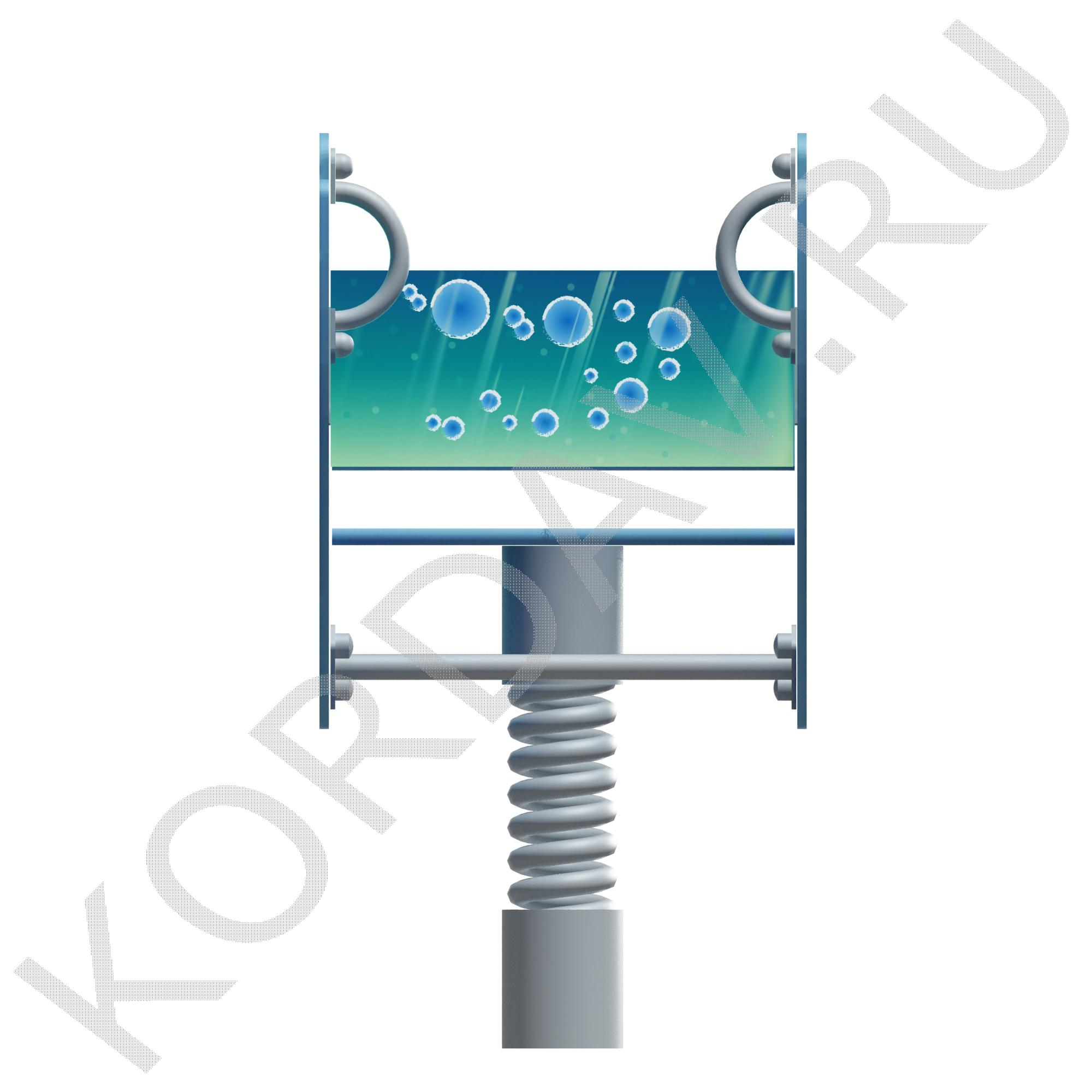 Основание качалки изготовлено из стальной трубы диаметром 130 мм, 42 мм, 32 мм и профильной трубы сечением 60 мм х 30 мм а так же стальных пластин толщиной 5 мм, окрашено порошковой краской в синий цвет. Оно соединено с пружиной из закалённой стали с толщиной прутка 26 мм, размер пружины: 490 мм х 127 мм.