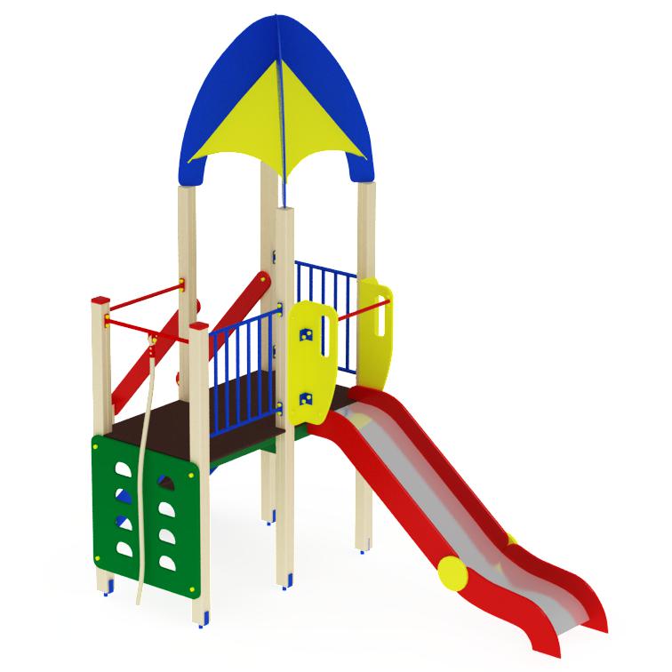 Игровая площадка «Космос» состоит из одной башки с четырехскатной крышей и арками, лестницей с перилами, скат-горкой, щита-скалолаза с канатом, перекладины и двух стальных оград. Для изготовления конструкции «Космос» используют: нескользкую фанеру ламинированную 18 мм; влагостойкую фанеру 18, 27, 30 мм; сталь нержавеющая 1,5 мм; профиль 25х40 мм; трубу с круглым сечением 32 мм; канат полиуретановый 27 мм; брусья клееные 90х90 мм. Лакокрасочные материалы для покрытия конструкции: порошковая, акриловая и двухкомпонентная полиуретановая краски.