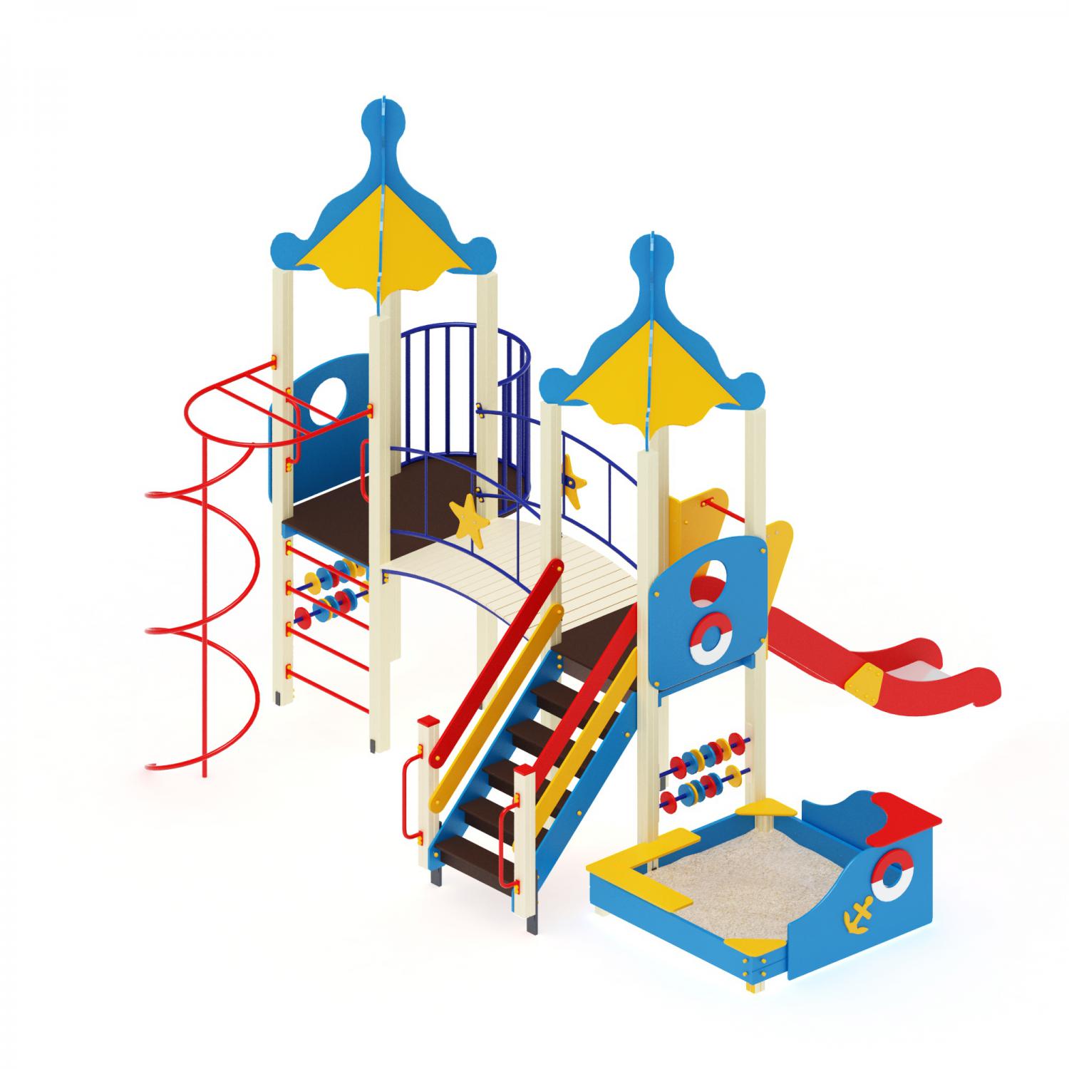 Большая детская площадка «Море» состоит из двух высоких башен с арками и четырехскатными крышами; скат-горки высотой 1,5 м; лестницы с перилами; дугообразного моста длиной 1,5 м; шеста вертикального со спиралью высотой 2,4 м; декорированной палубы; двух пар счет; песочницы со скамьями и бортами. Материалы для изготовления игровой площадки: уголки стальные 40х40 мм; брусья клееные 90х90 мм; устойчивая к влаге фанера 18, 37 мм; трубы металлические диаметром 32 мм; антискользящая ламинированная фанера 24 мм; полосы стальные 4х40 мм; лист нержавеющей стали 1,5 мм; профиль стальной 25х40 мм.