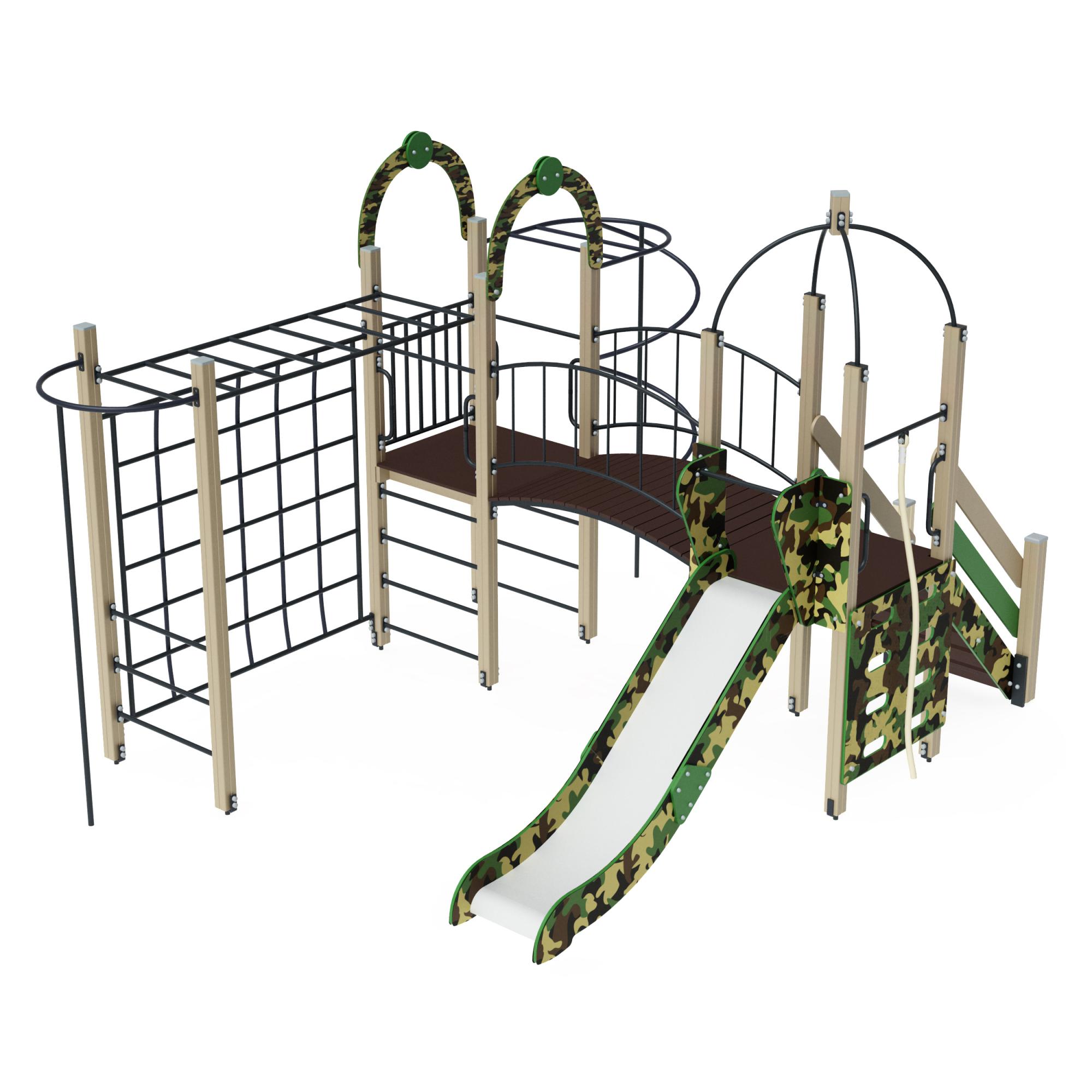 Скат горки шириной 530 мм, выполнен из нержавеющей стали толщиной 1,5 мм (цельный лист), утопленный в паз бортиков. Борта — из влагостойкой фанеры толщиной 24 мм, шириной не менее 150 мм. Опорный каркас — из профиля 40×25 и труб диаметром 33 мм. Стартовая площадка ограждена стальной перекладиной из трубы диаметром 27 мм, установленной на высоте не менее 600 мм от уровня стартового участка. Размеры горки — 530×2170×1200 мм. Количество — 1 шт.