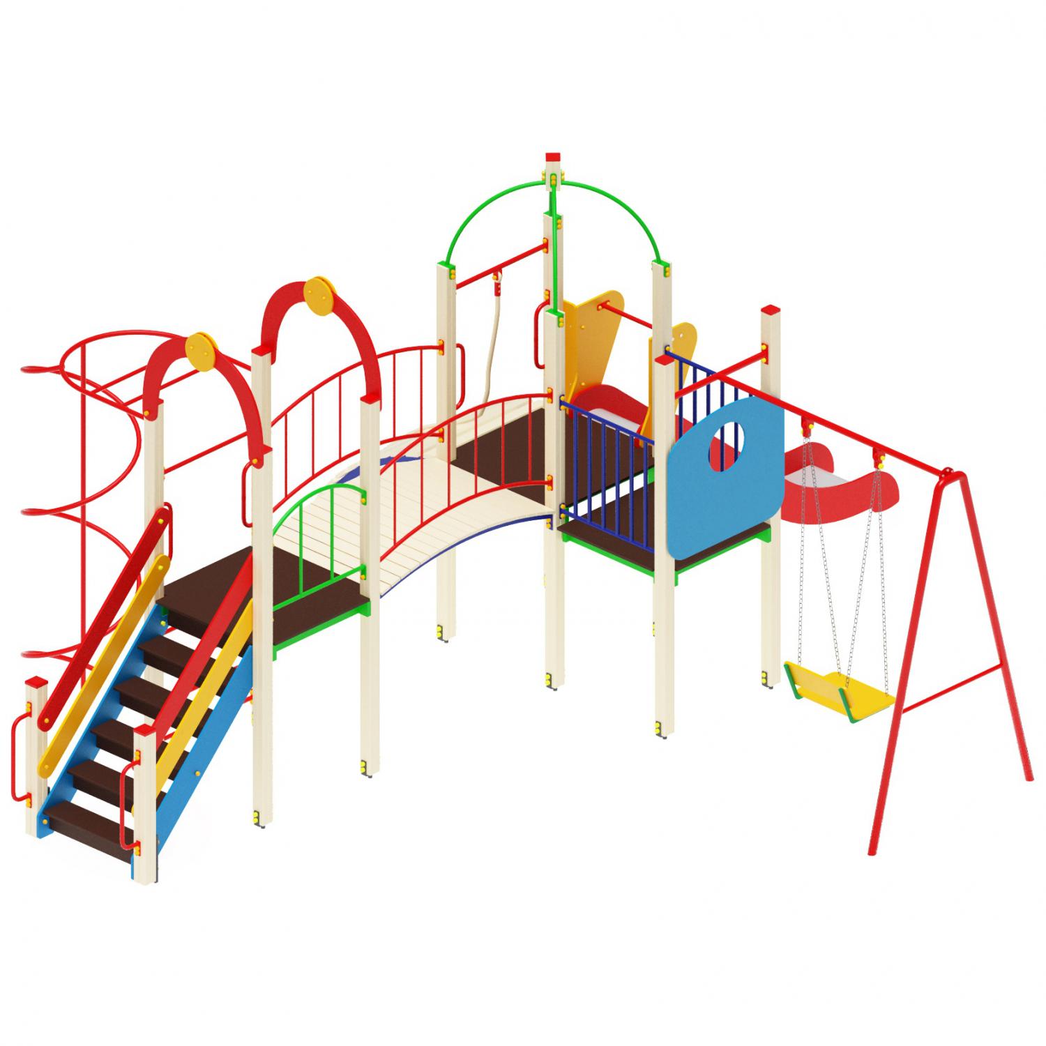 Детская площадка состоит из: качели цепные, скат-горка, бум с канатом, мост дугообразный, мини шведские стенки, шест со спиралью и перекладинами, лестница с перилами и площадки с ограждениями.