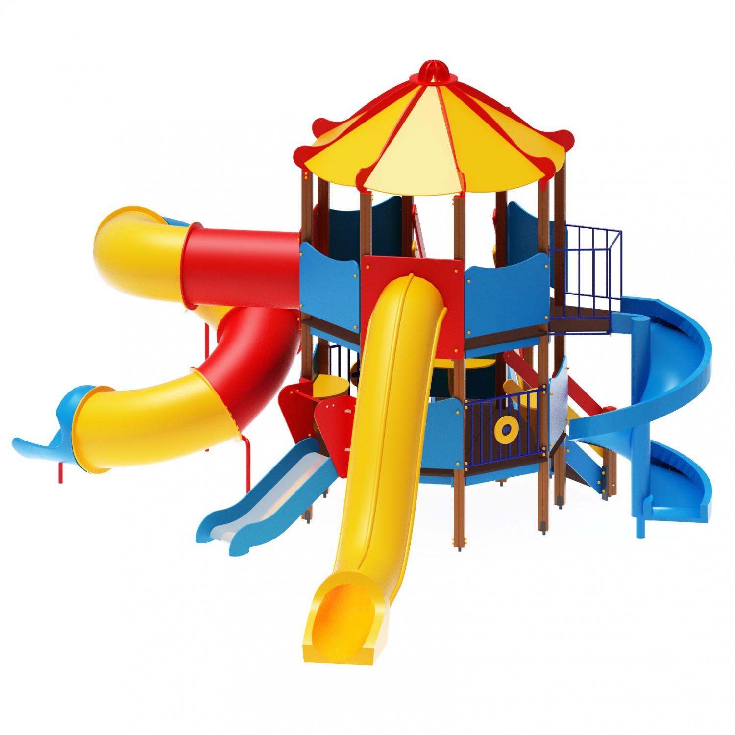 БашняБашня восьмигранная выполнена из восьми клеёных брусьев 100х100 мм высота 4000 мм; пол из ламинированной фанеры, с антискользящим покрытием, состоящий из части пола размером 2410х800 мм и двух частей размером 2410х805 мм толщиной 18 мм. Настил пола укладывается на лаги из влагостойкой фанеры толщиной 24 мм. Башня по периметру полов закрыта решетчатым ограждением и щитами-ограждениями из фанеры толщиной 18 мм, окрашенными в синий и красный цвет. Отметка полов башни от планировочной отметки площадки 750 мм и 2000 мм.