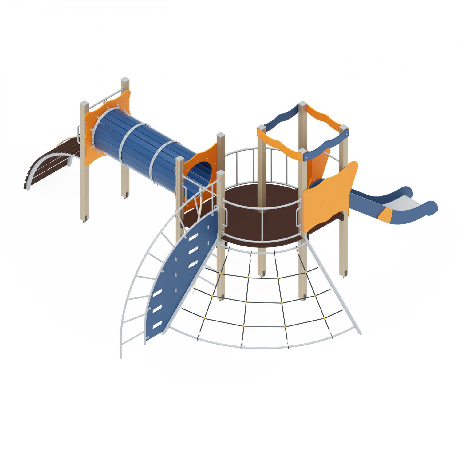 Башня сдвоенная выполнена из клеёных брусьев 100х100 мм высотой 2800 мм и 2200 мм. Пол из ламинированной фанеры, с антискользящим покрытием 1897х950 мм, толщиной 18 мм. Над одной полубашней имеются декоративные арки из фанеры толщиной 18 мм размером 990х180 мм. Башня с одной стороны закрыта бортом, выполненным из фанеры влагостойкой толщиной 18 мм, размером 1000х800 мм. Высота пола от планировочной отметки 1200 мм. 1 комплект