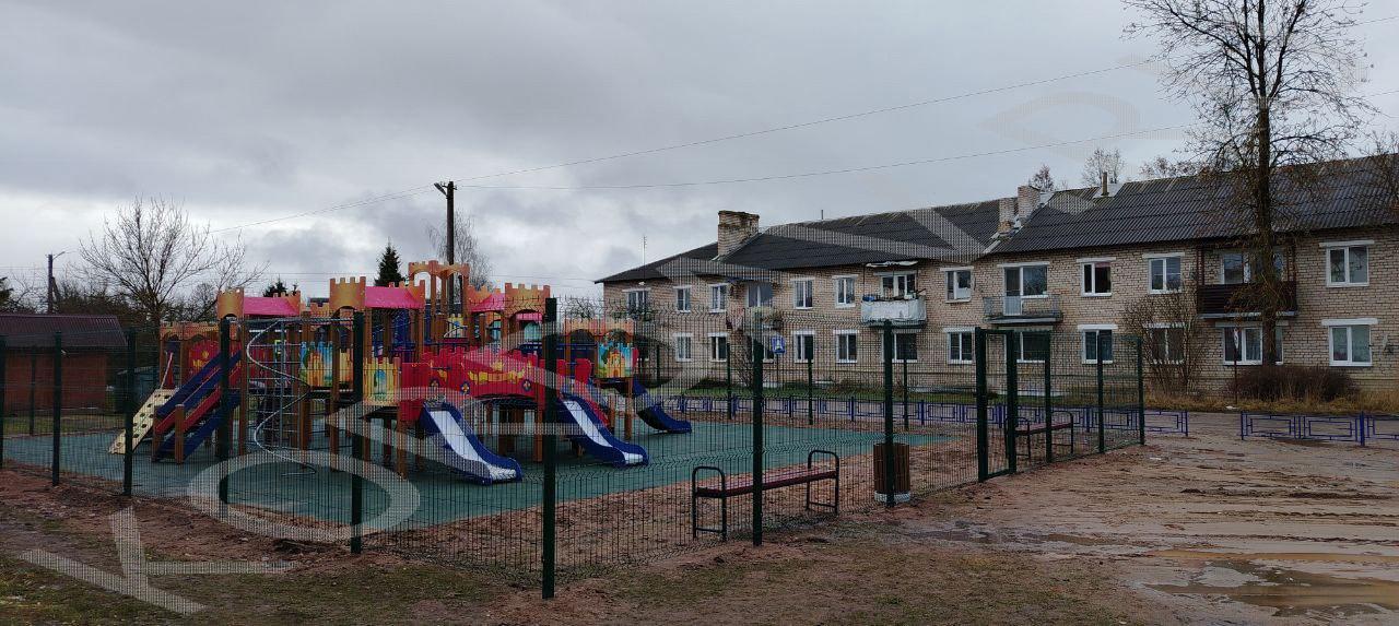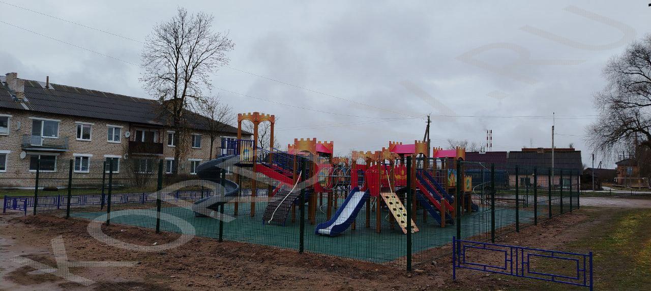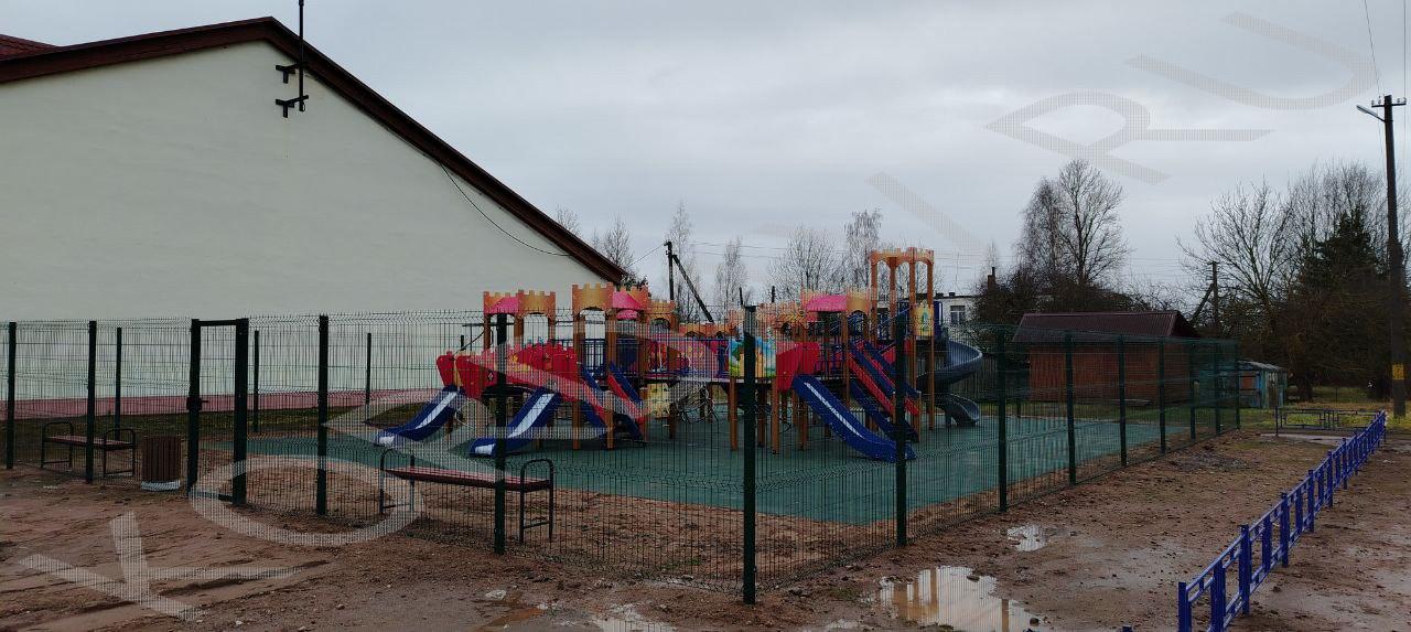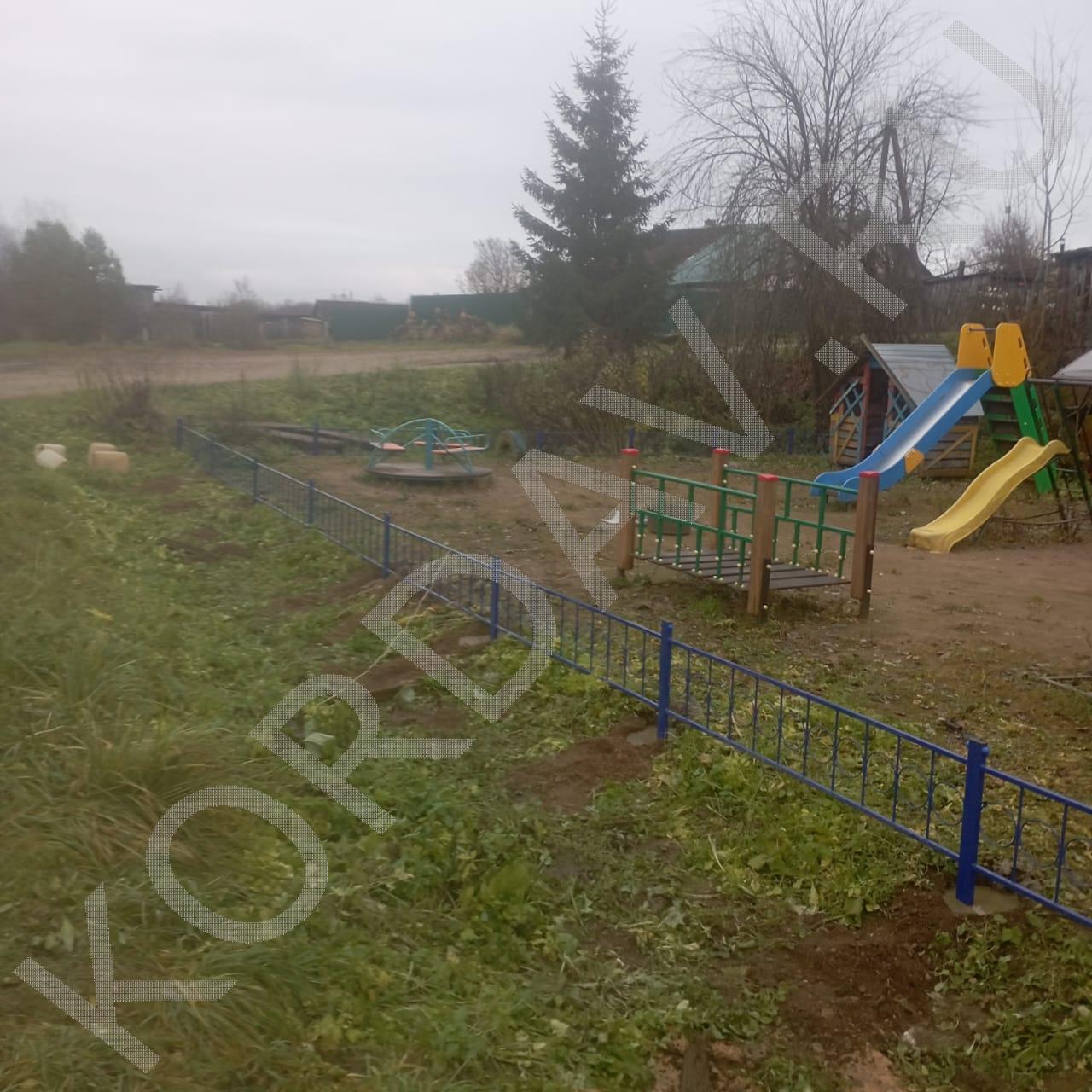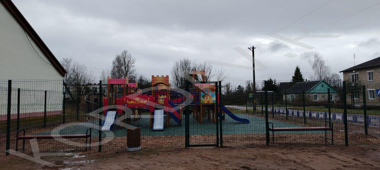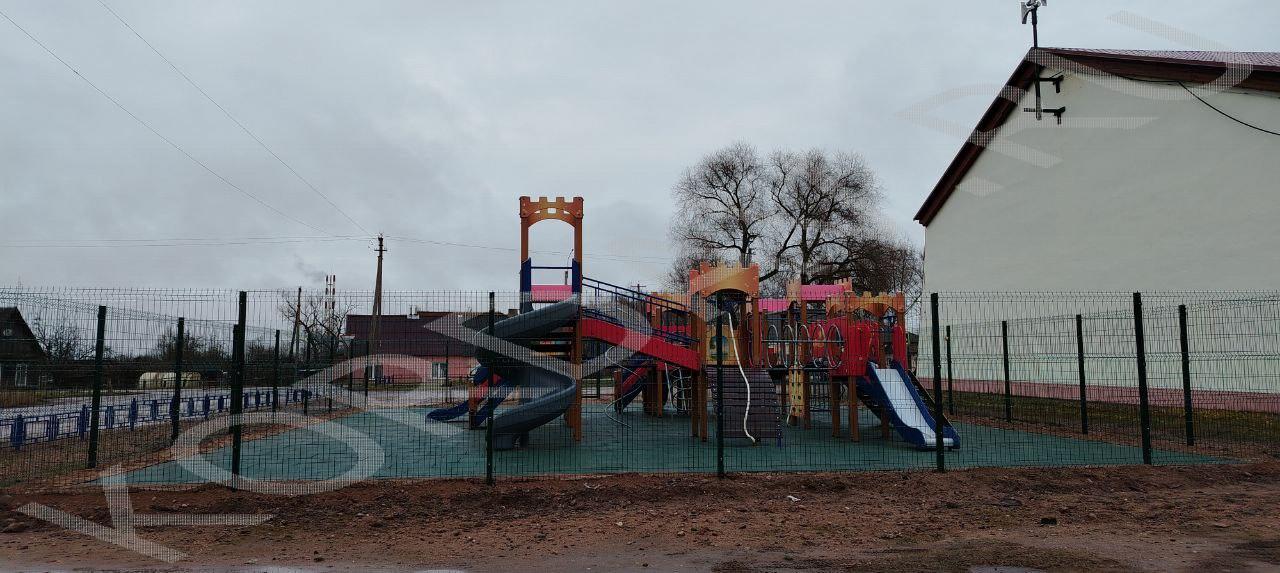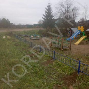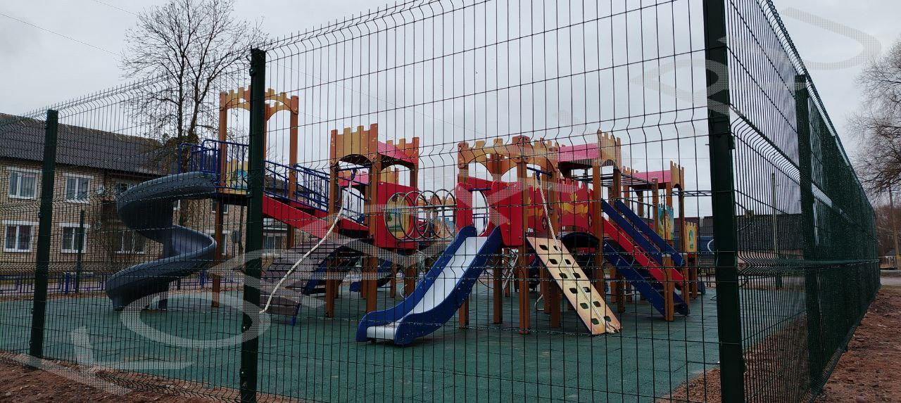Детская площадка с резиновой плиткой и металлическим ограждением. Использовалось оборудование: