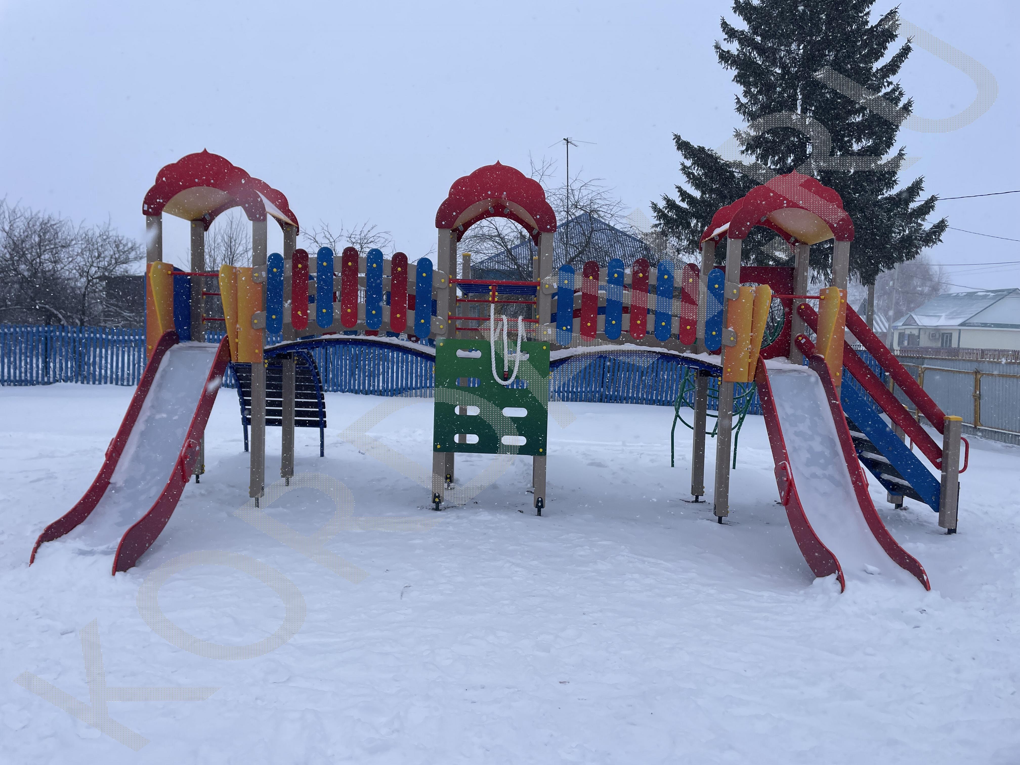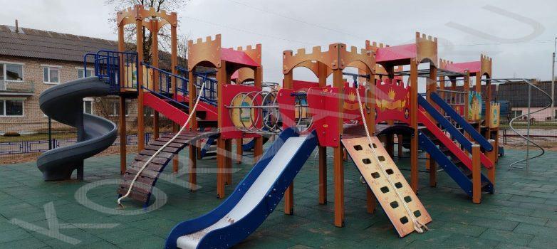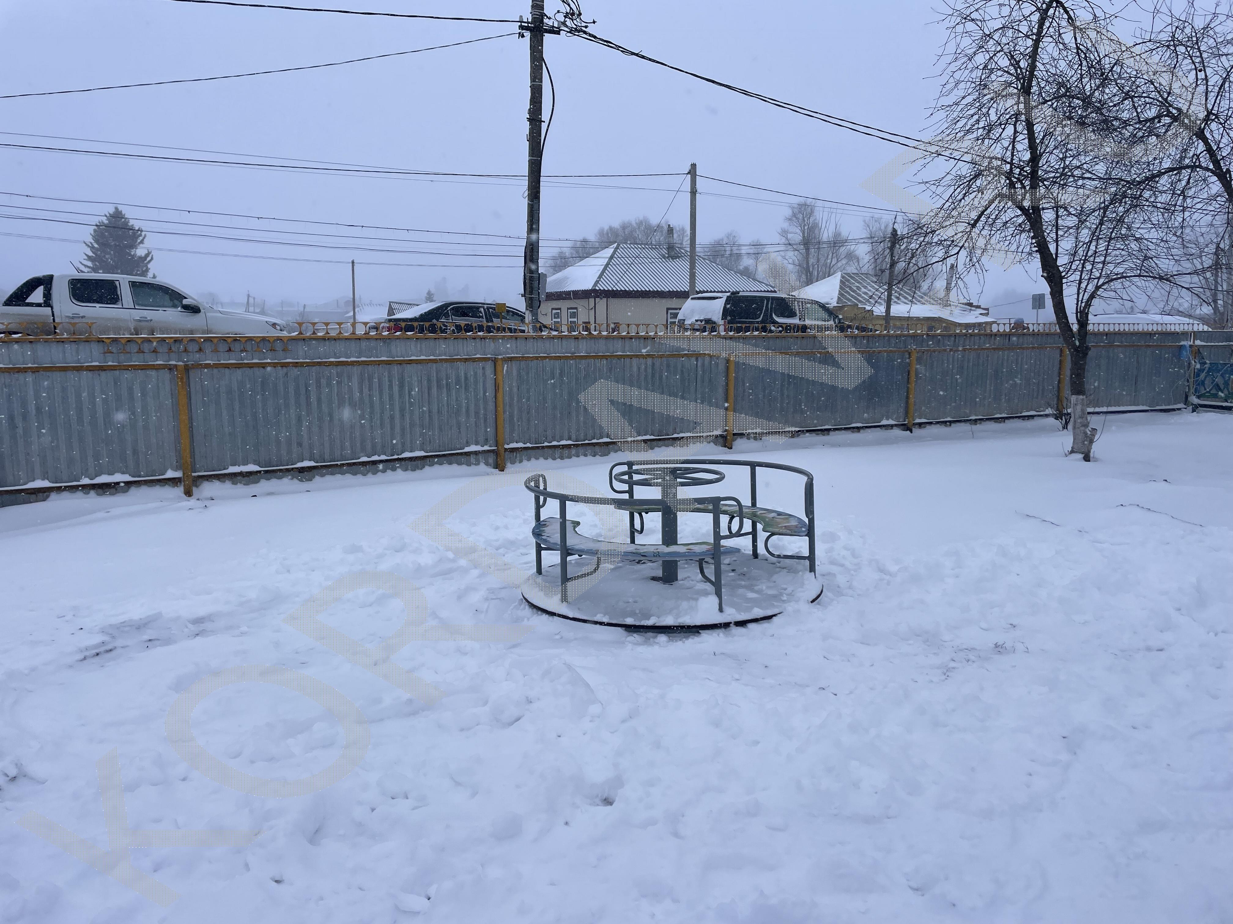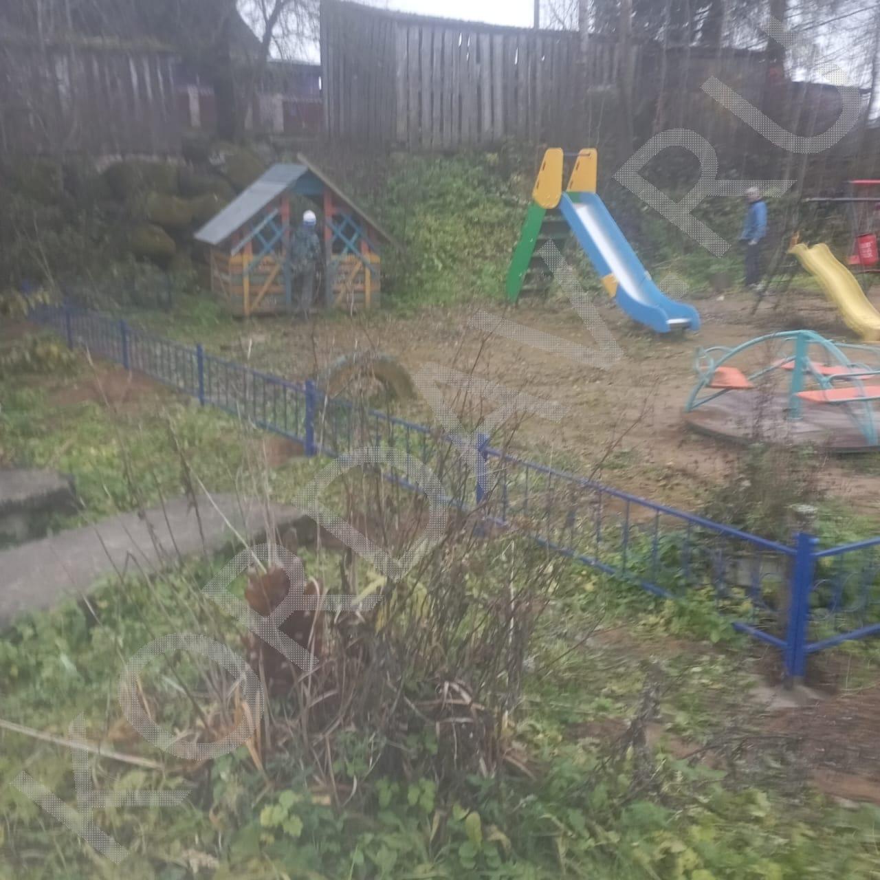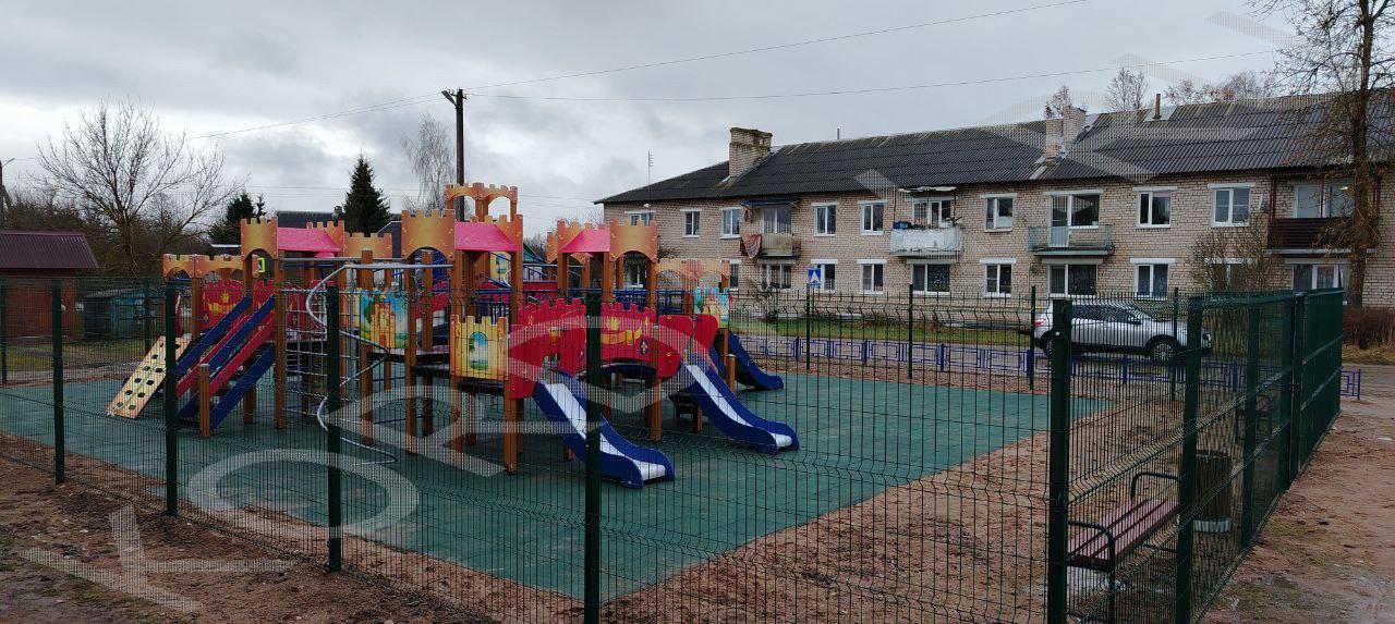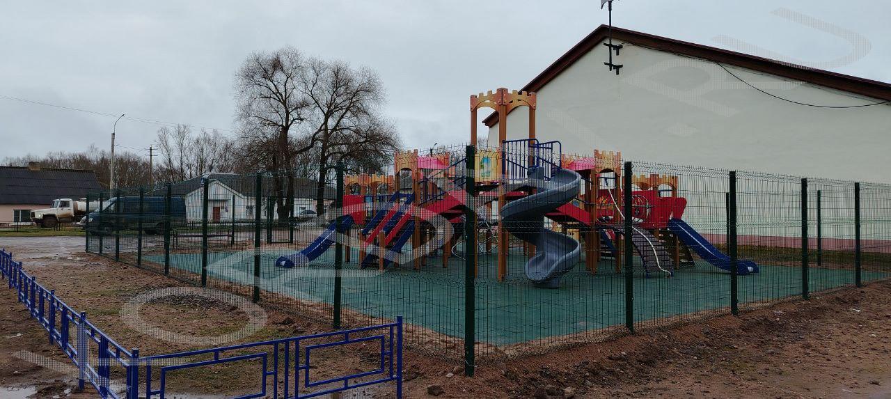 Детская площадка с резиновой плиткой и металлическим ограждением. Использовалось оборудование: