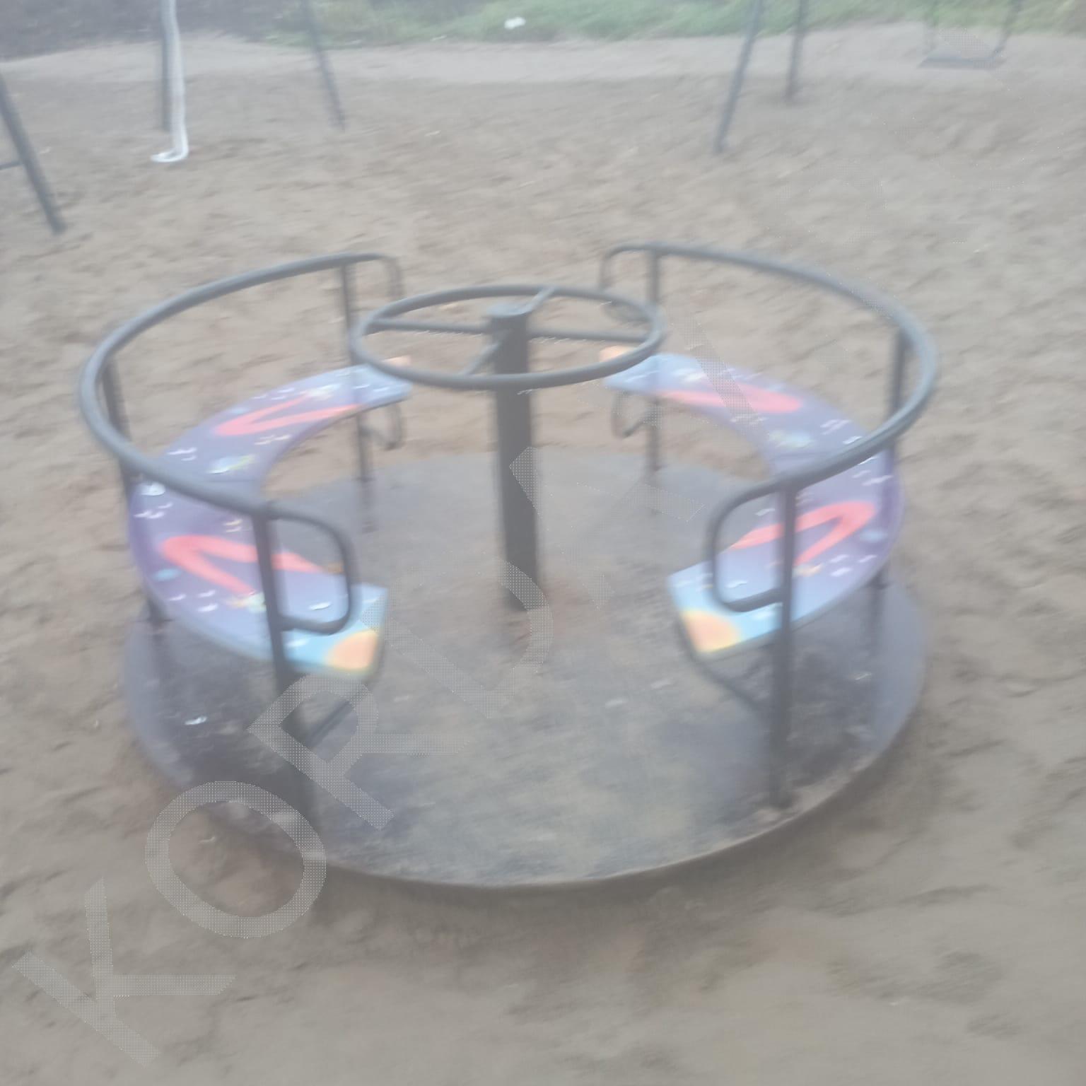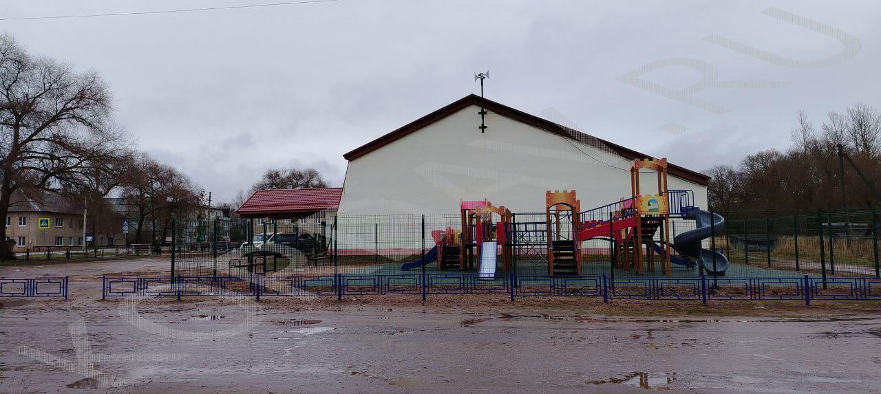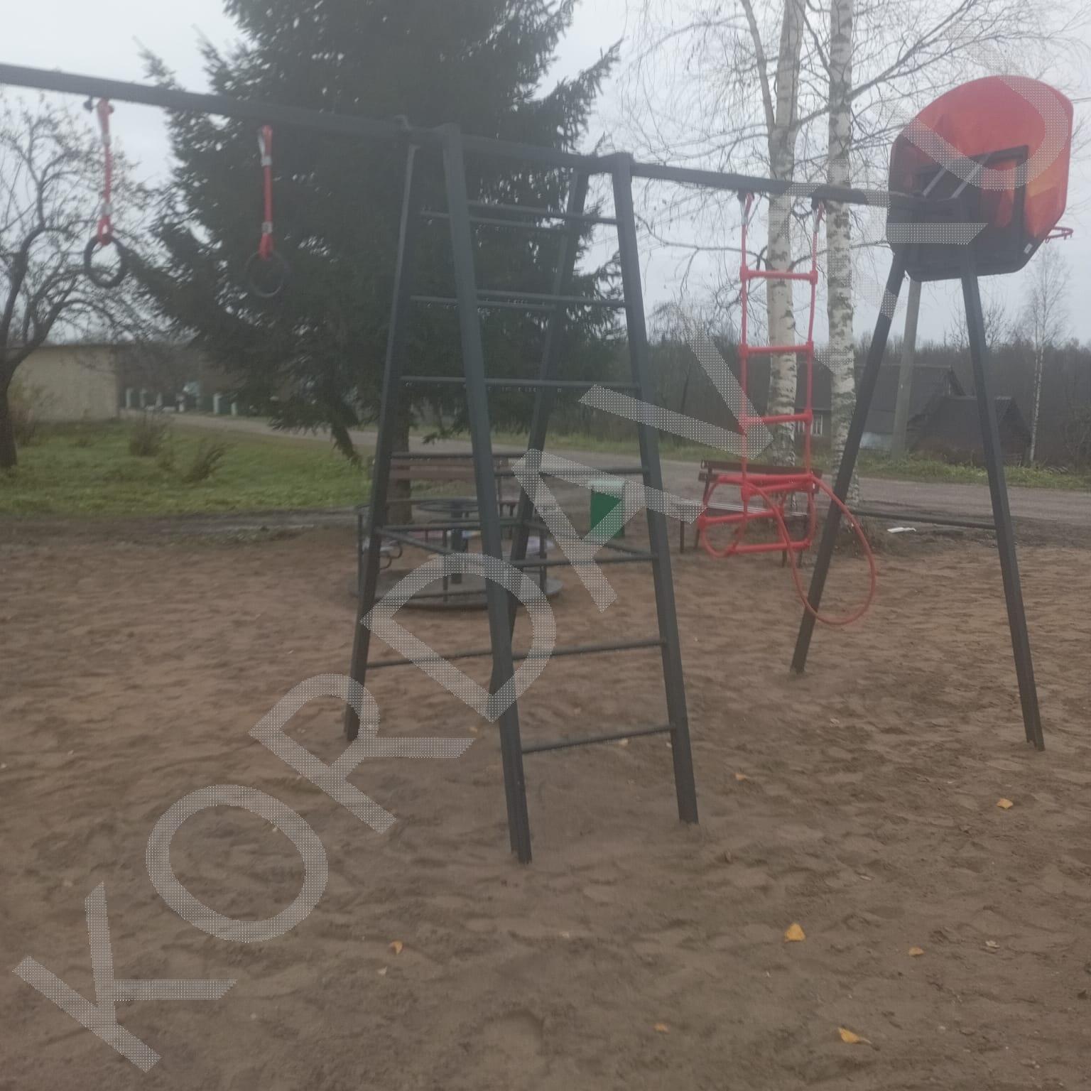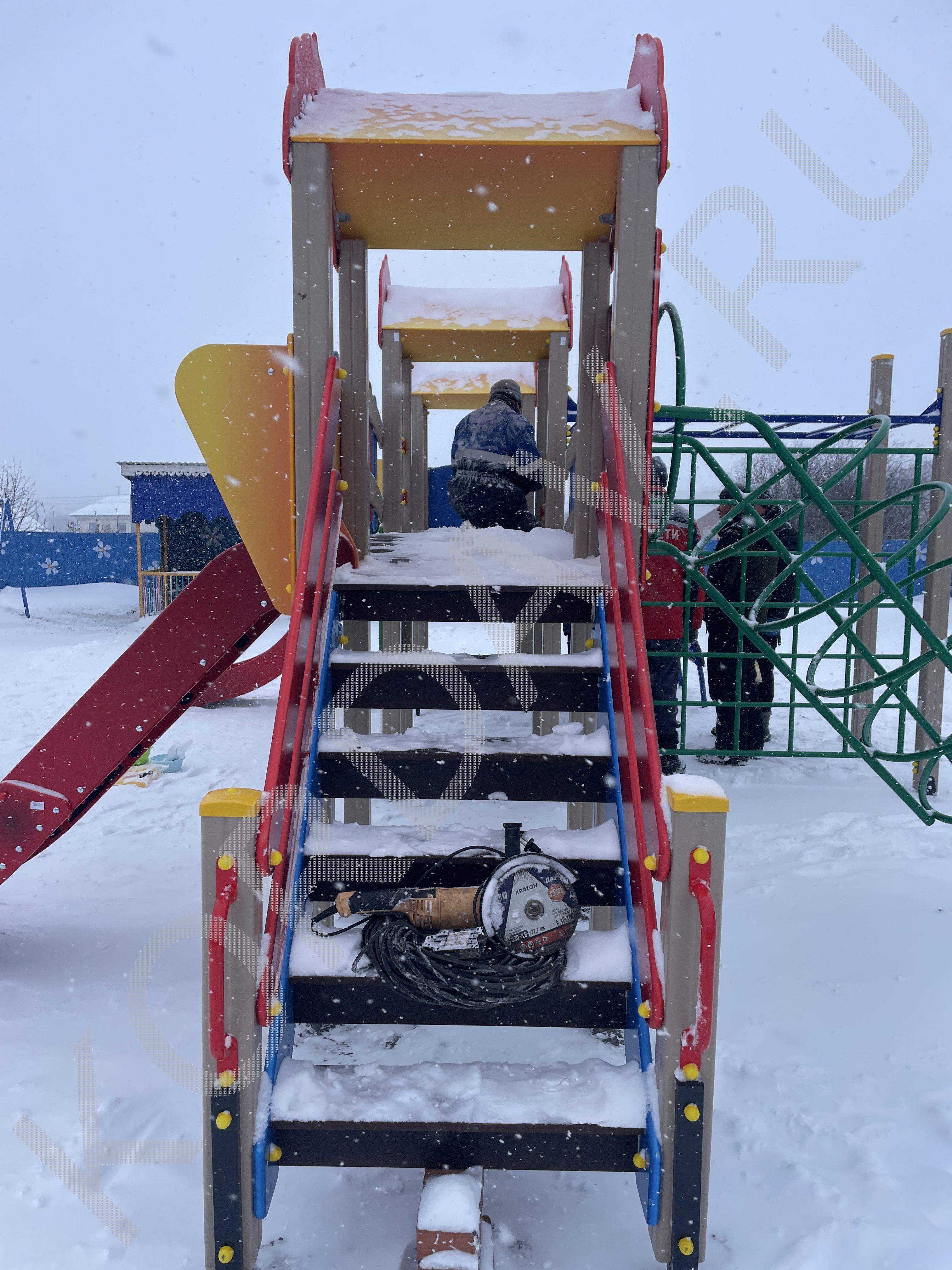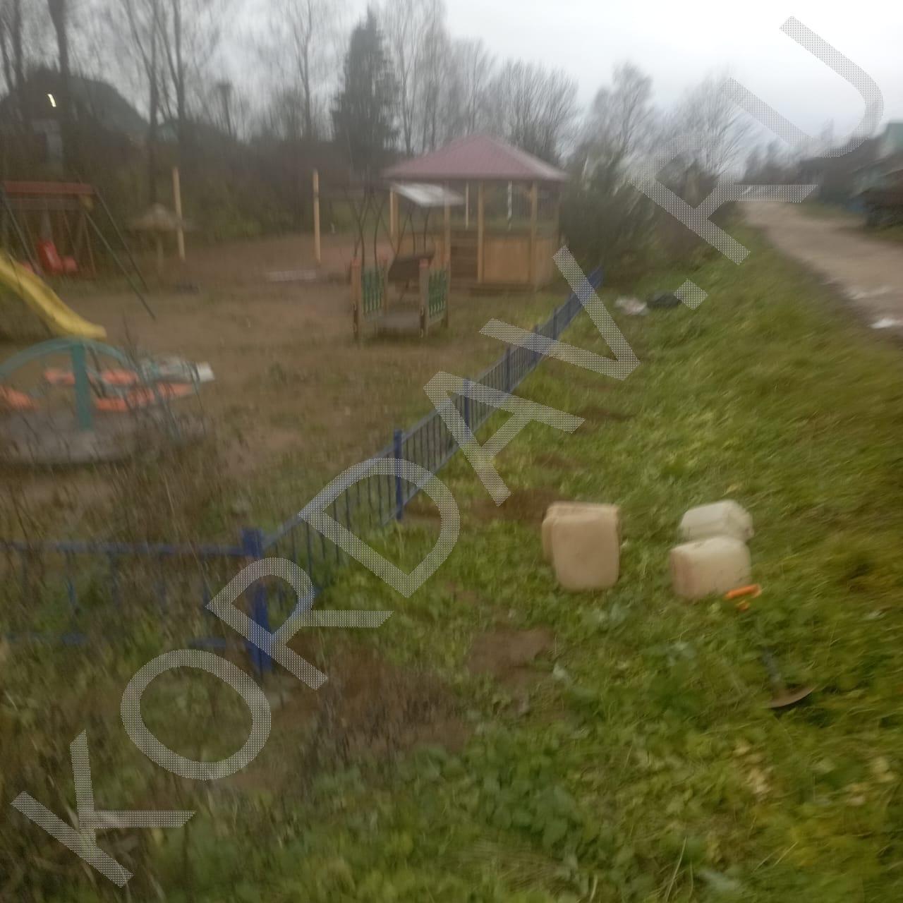 Детская площадка с резиновой плиткой и металлическим ограждением. Использовалось оборудование: