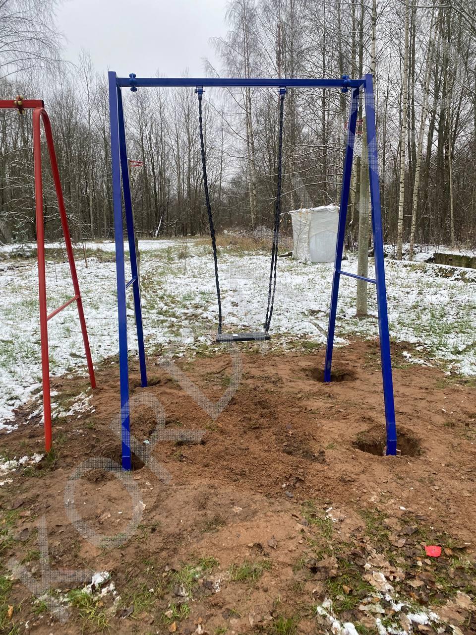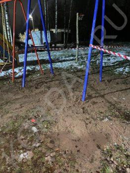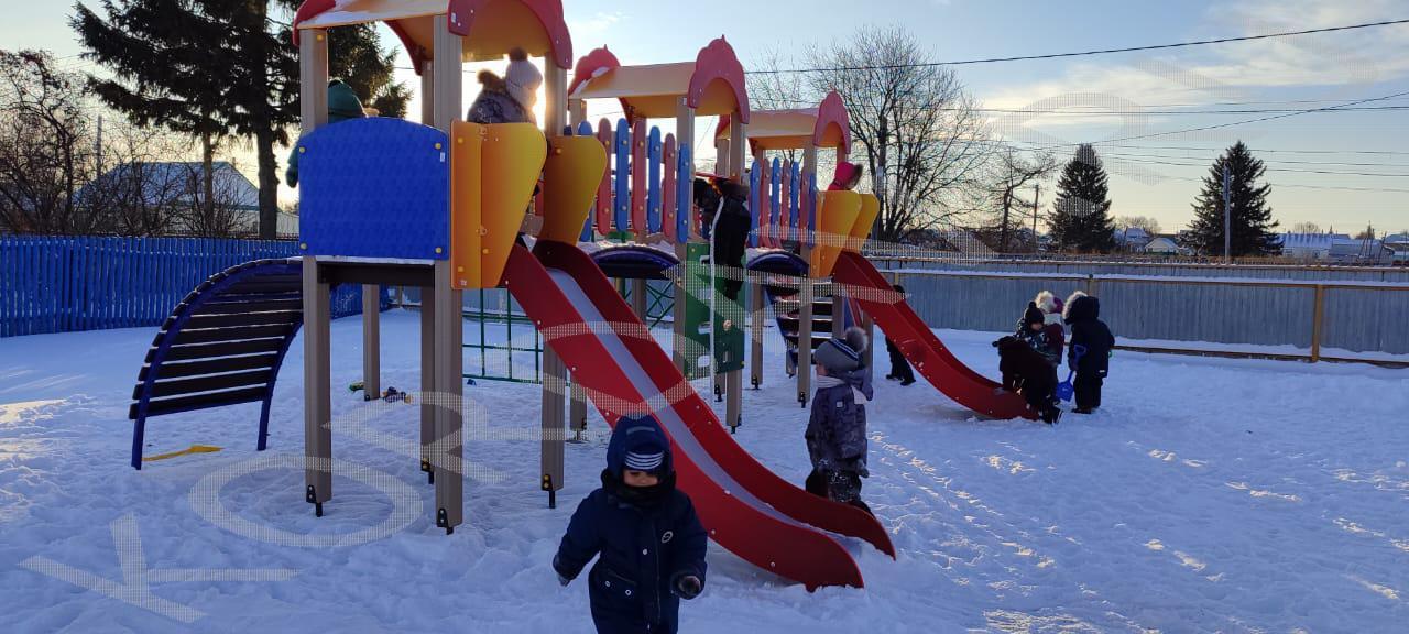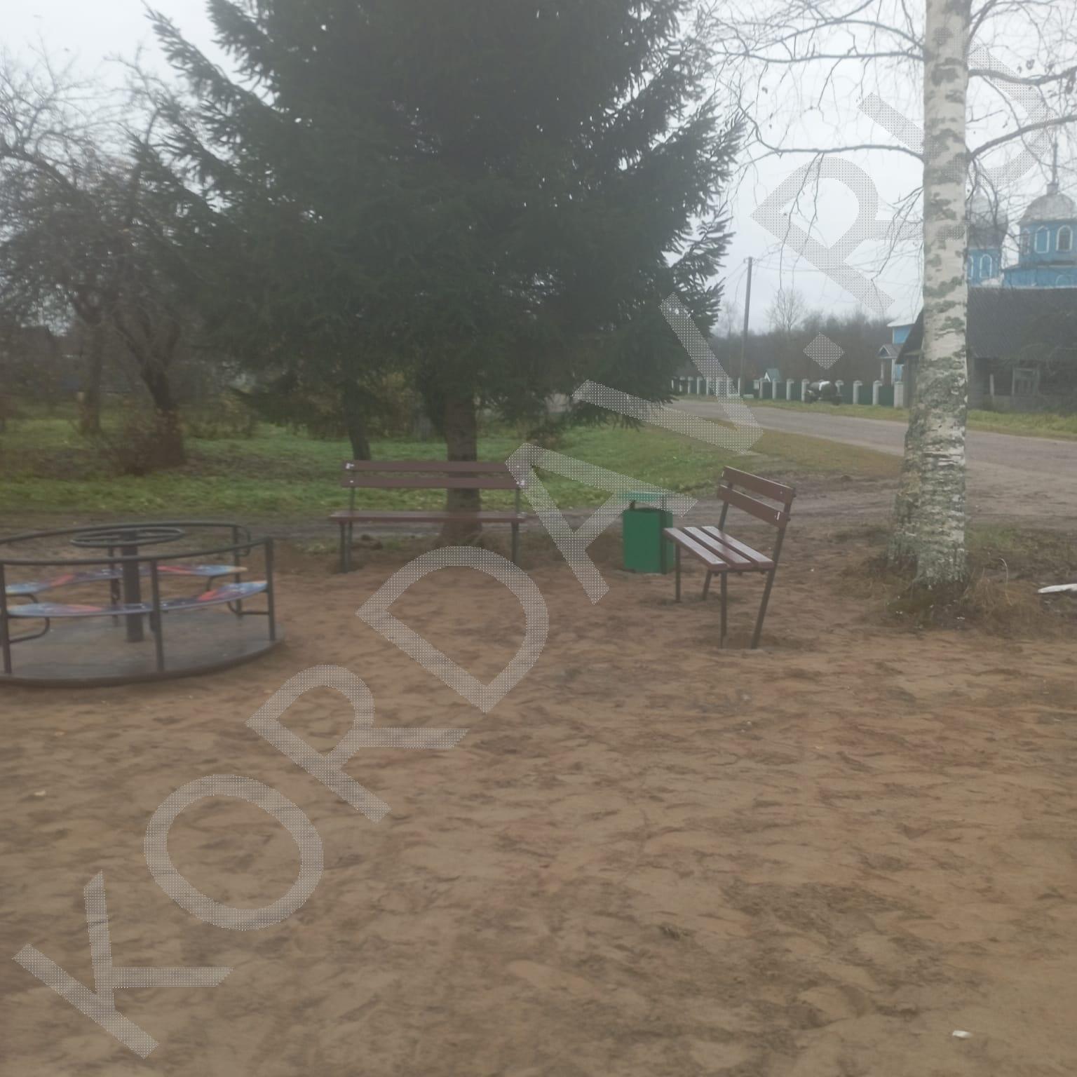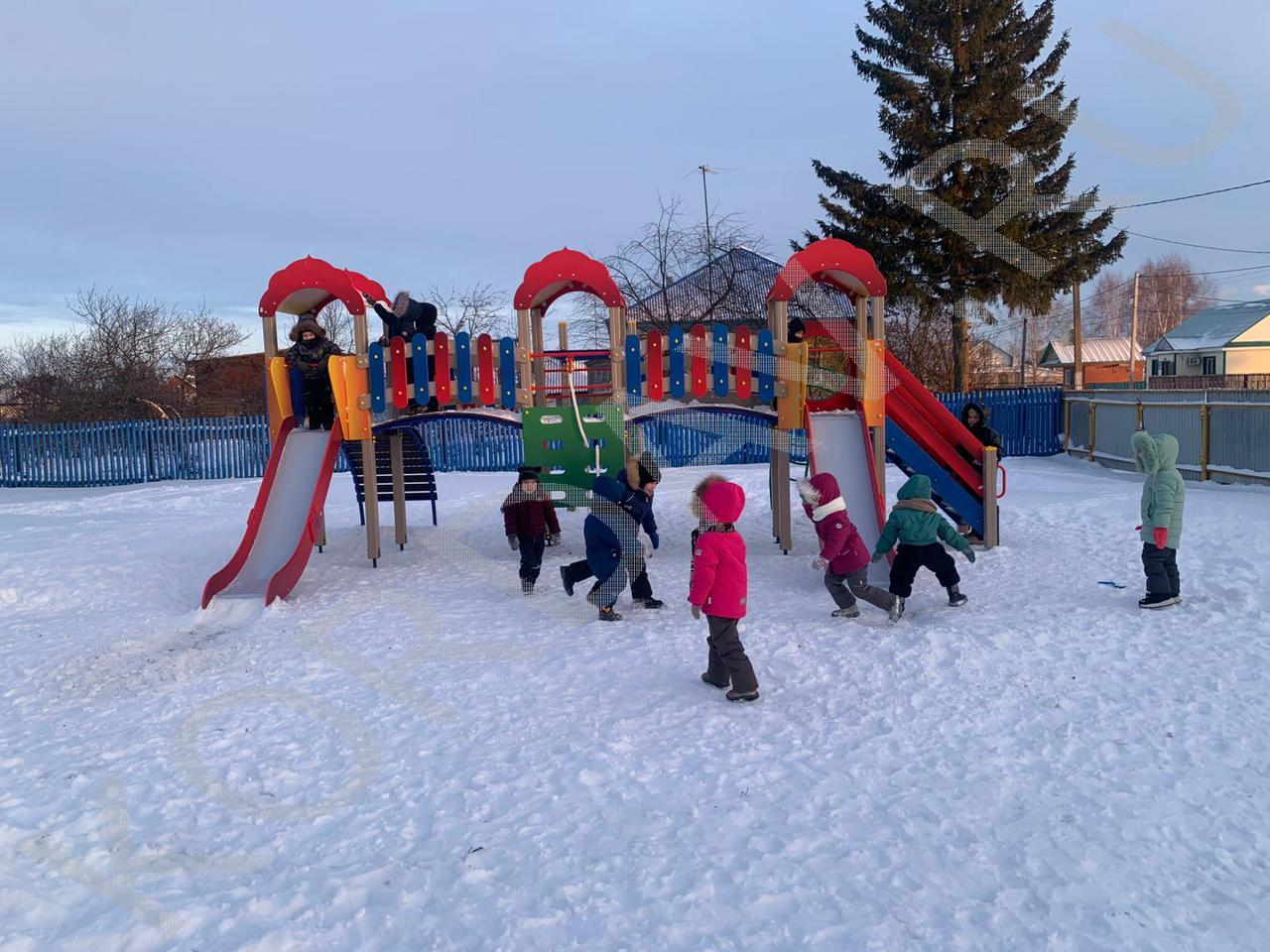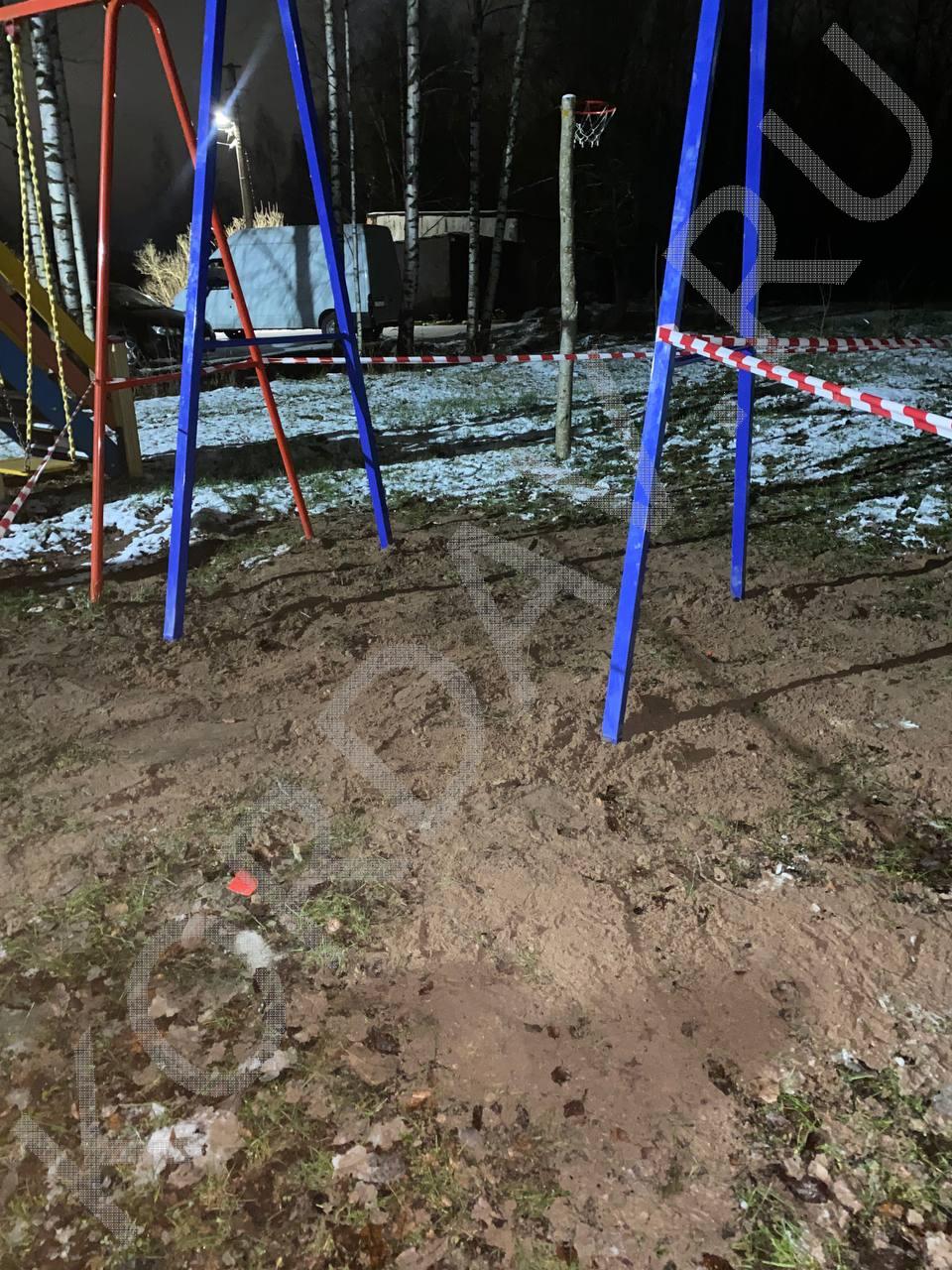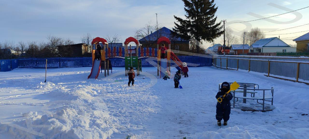 Детская площадка с резиновой плиткой и металлическим ограждением. Использовалось оборудование:
