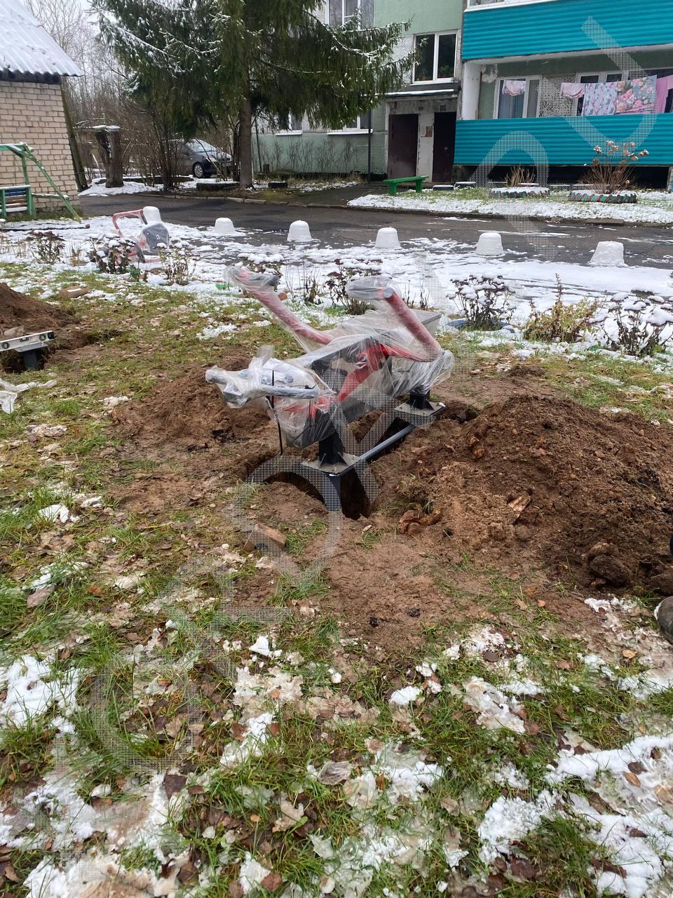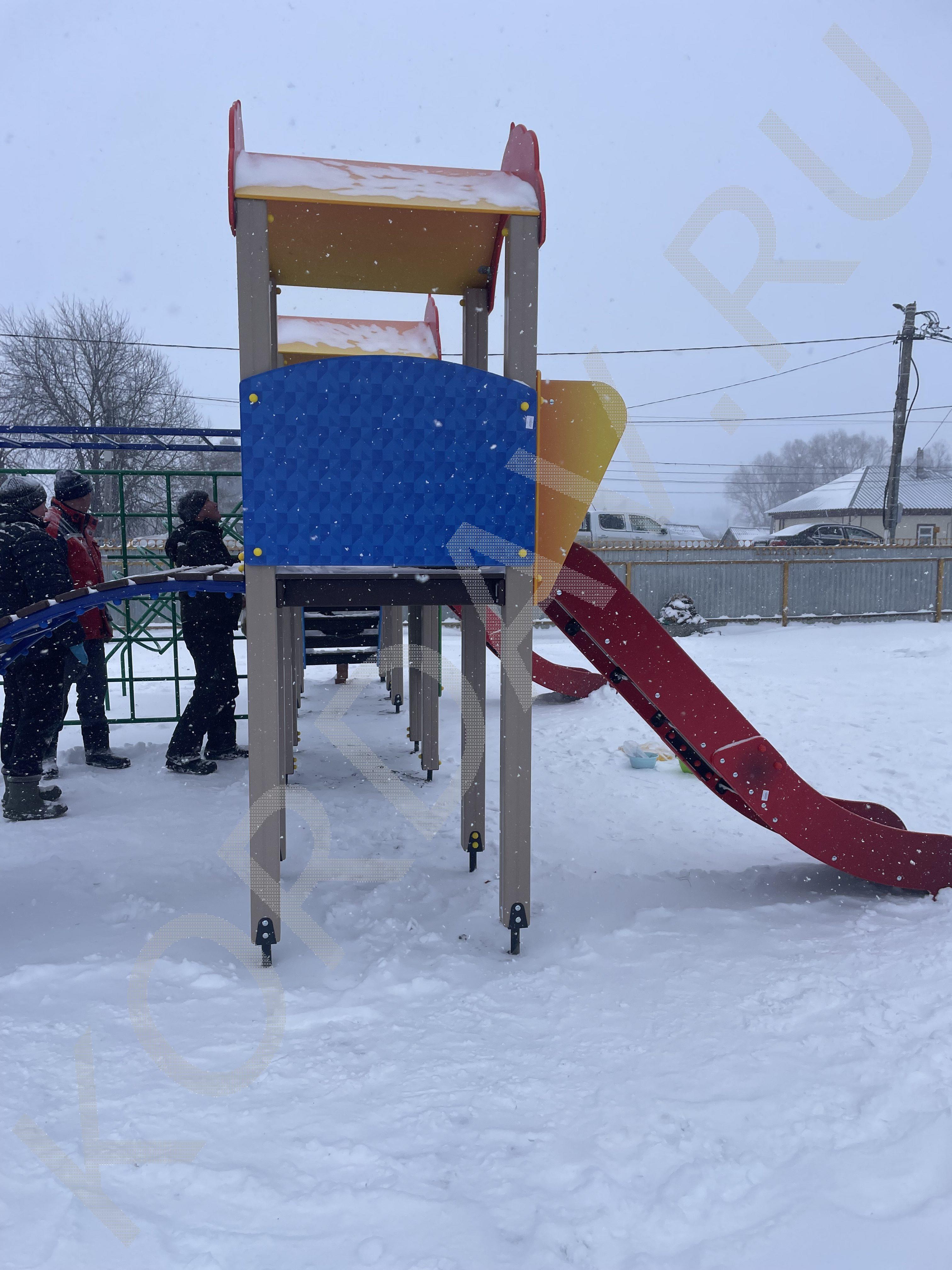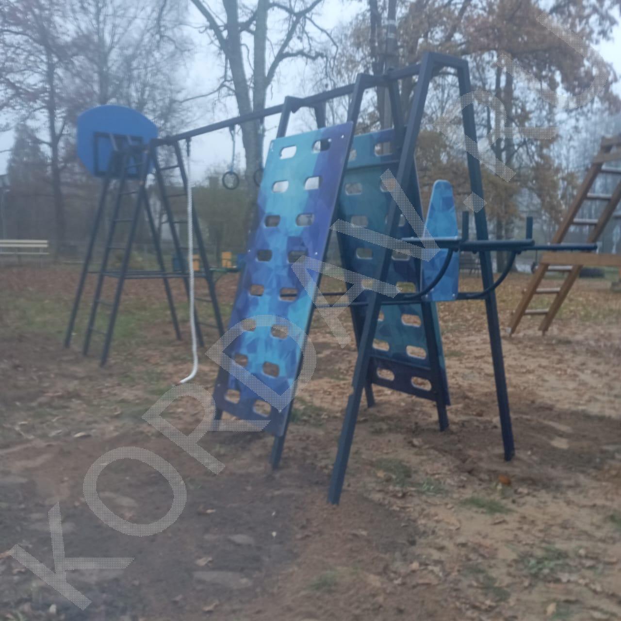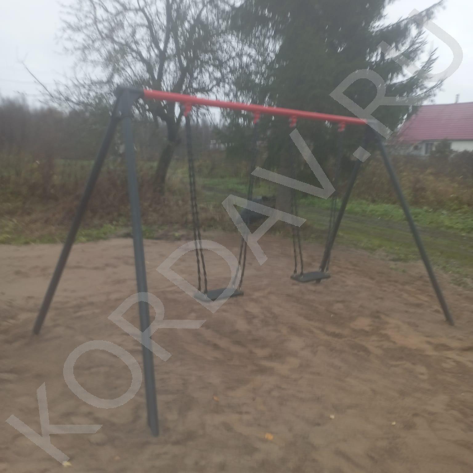 Детская площадка с резиновой плиткой и металлическим ограждением. Использовалось оборудование: