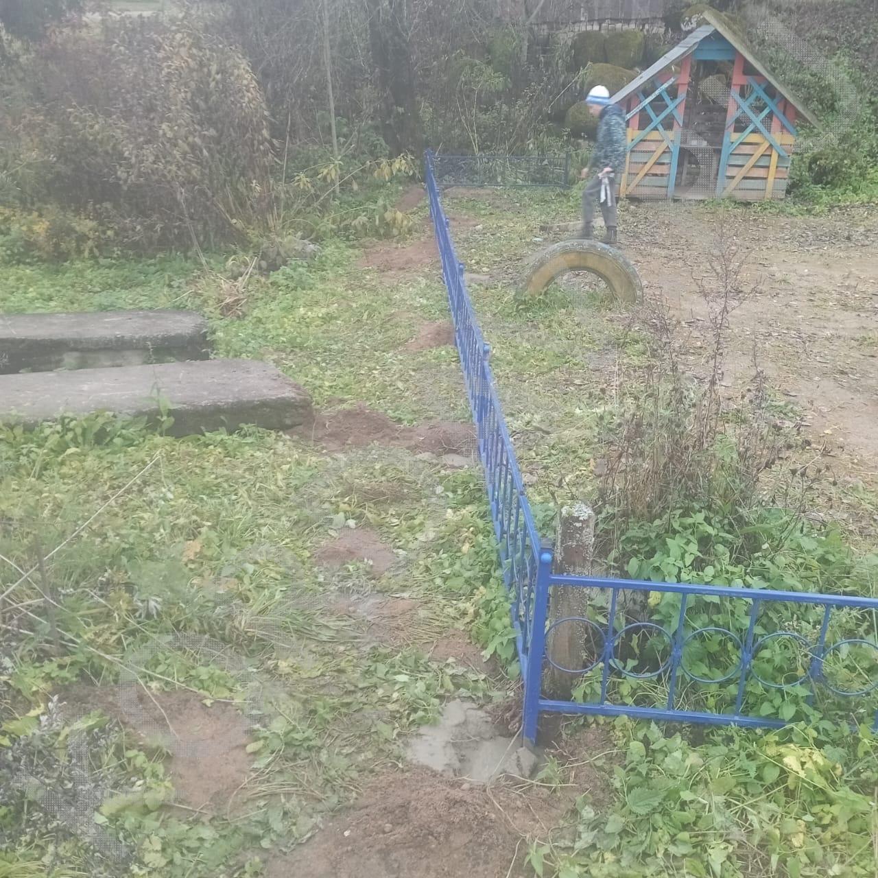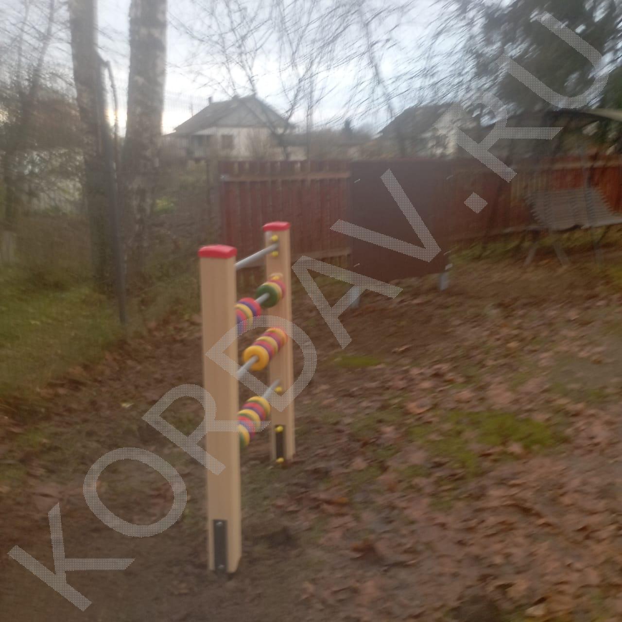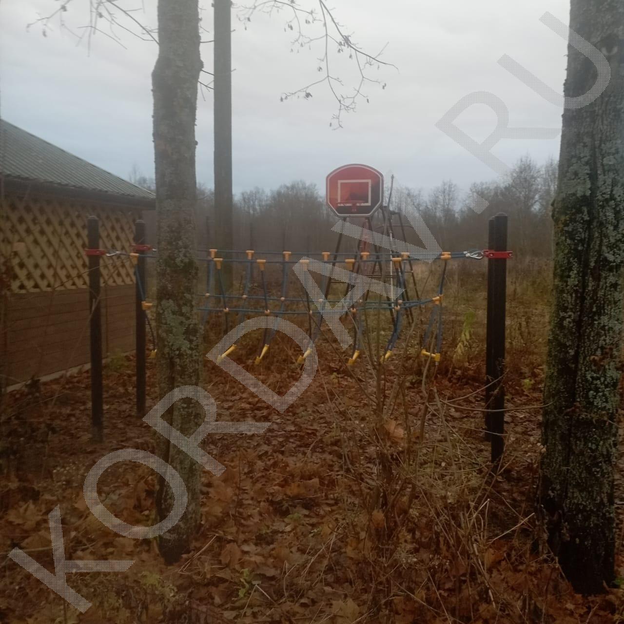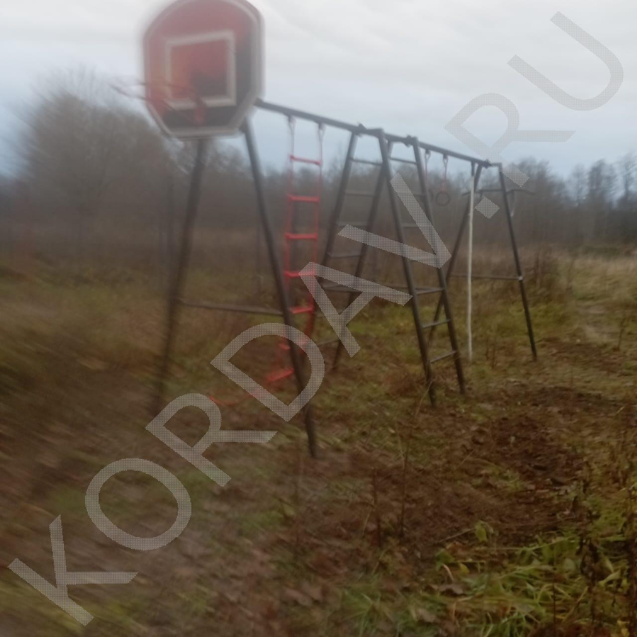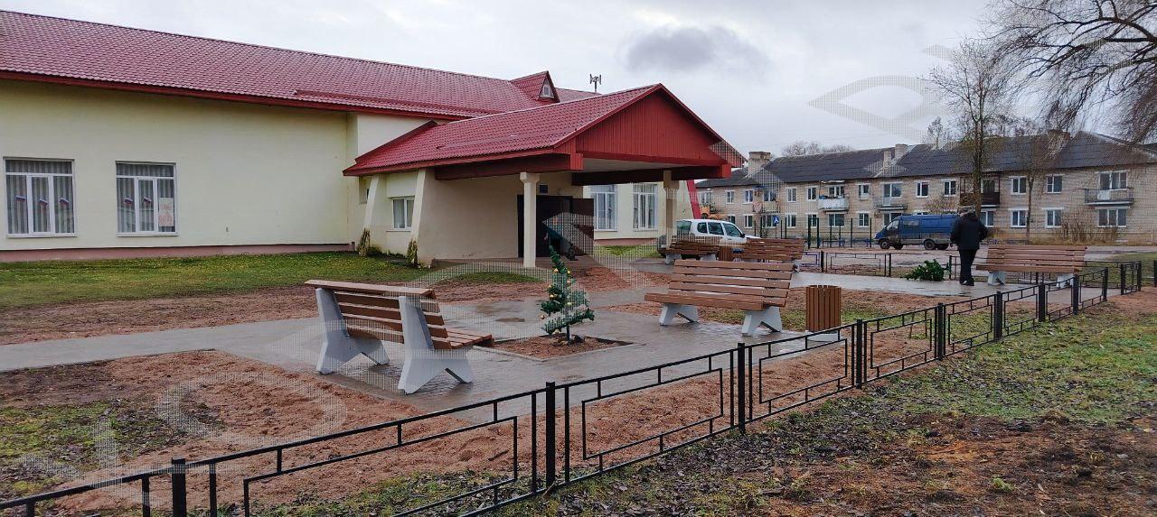 Детская площадка с резиновой плиткой и металлическим ограждением. Использовалось оборудование:
