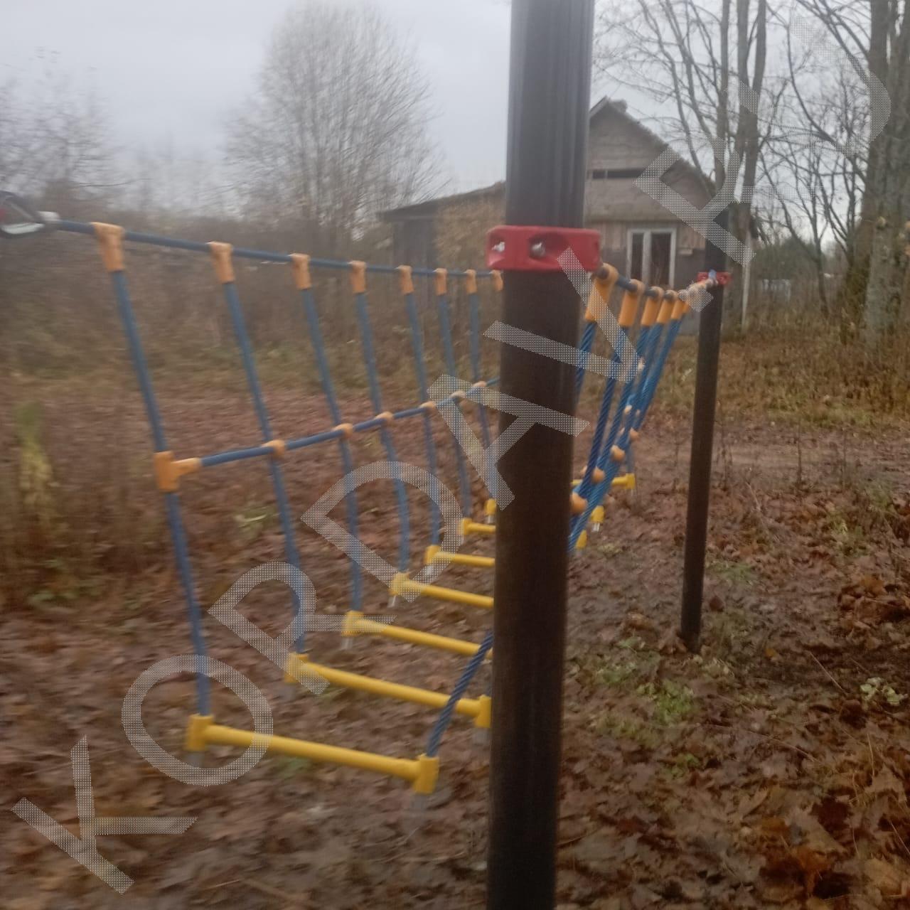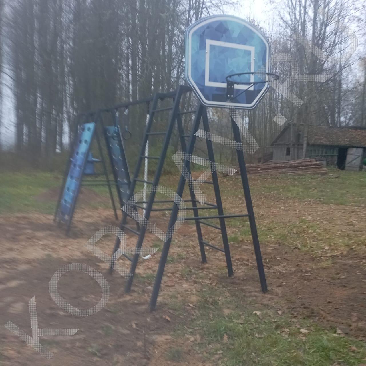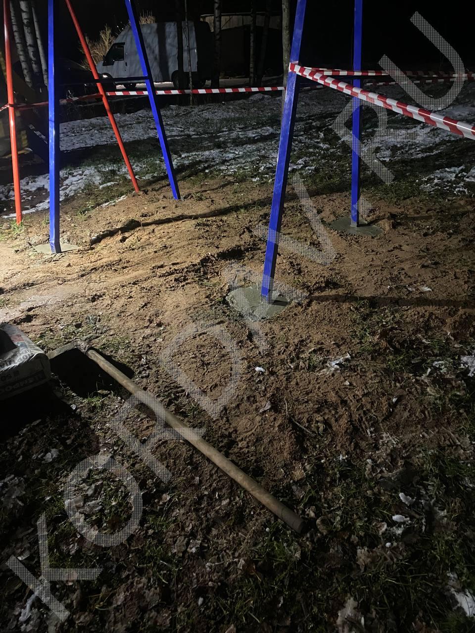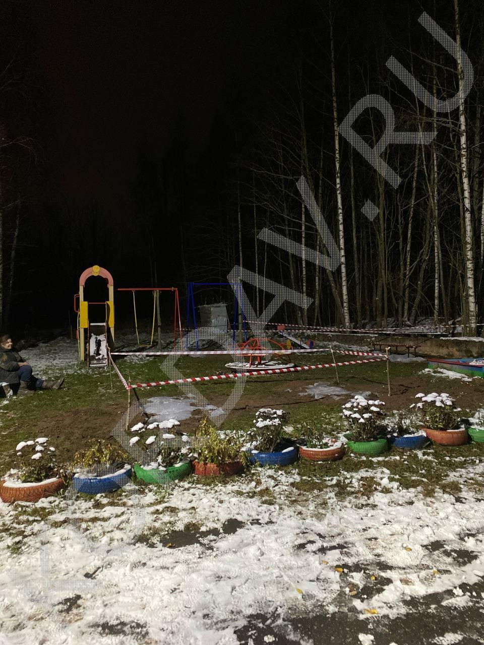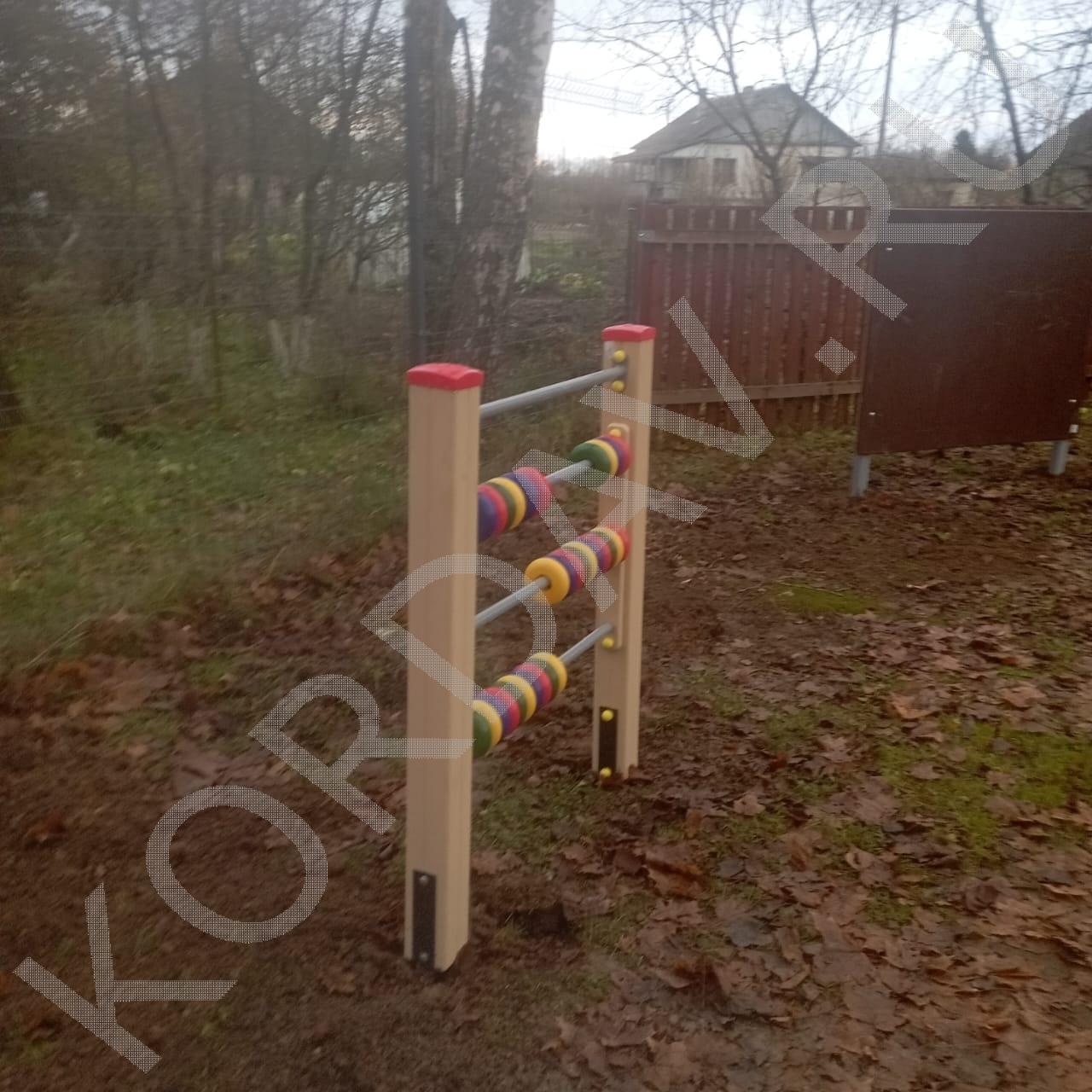 Детская площадка с резиновой плиткой и металлическим ограждением. Использовалось оборудование: