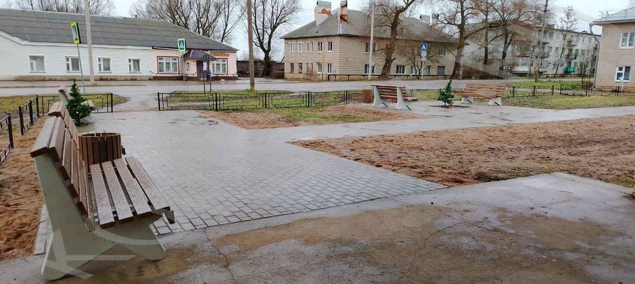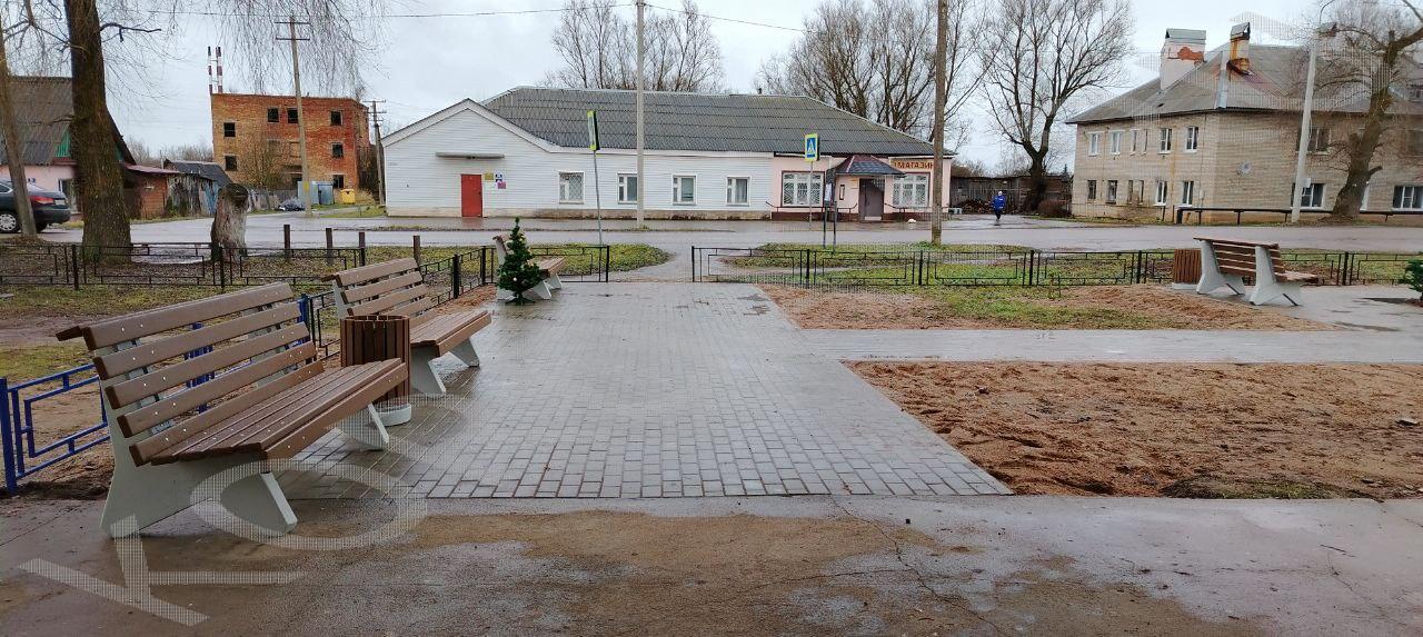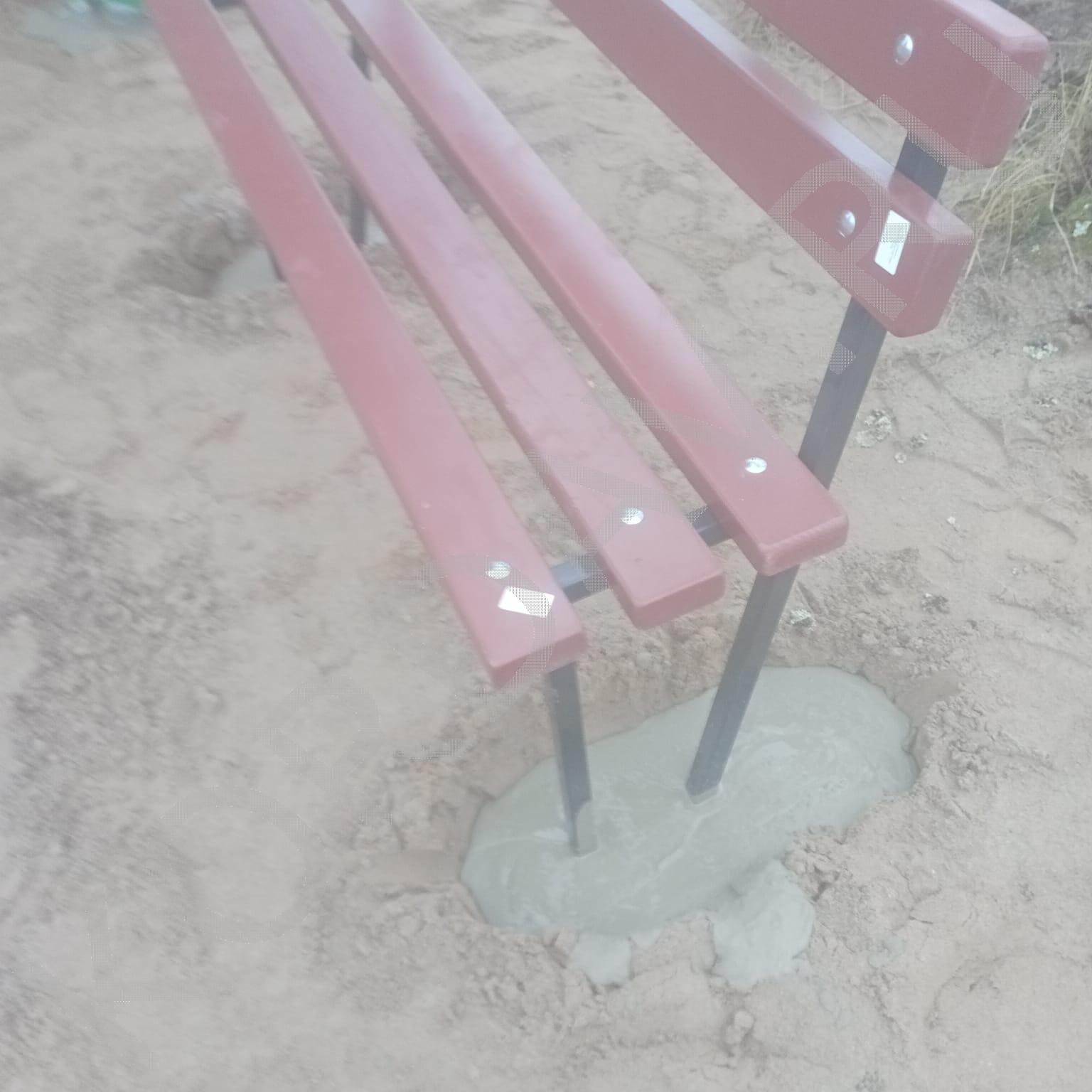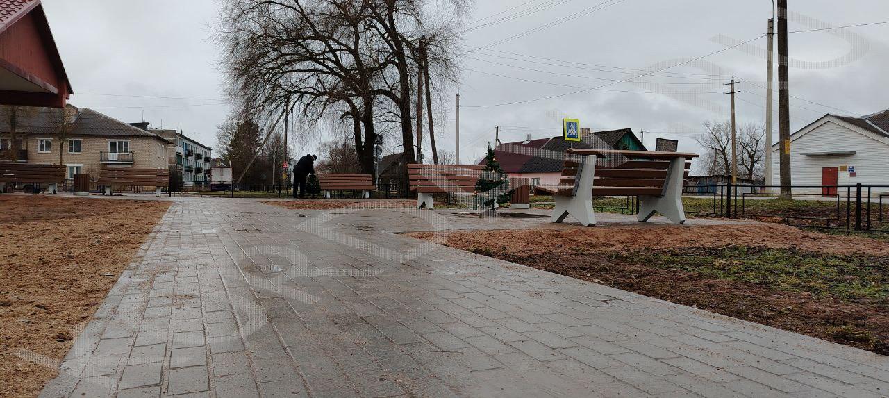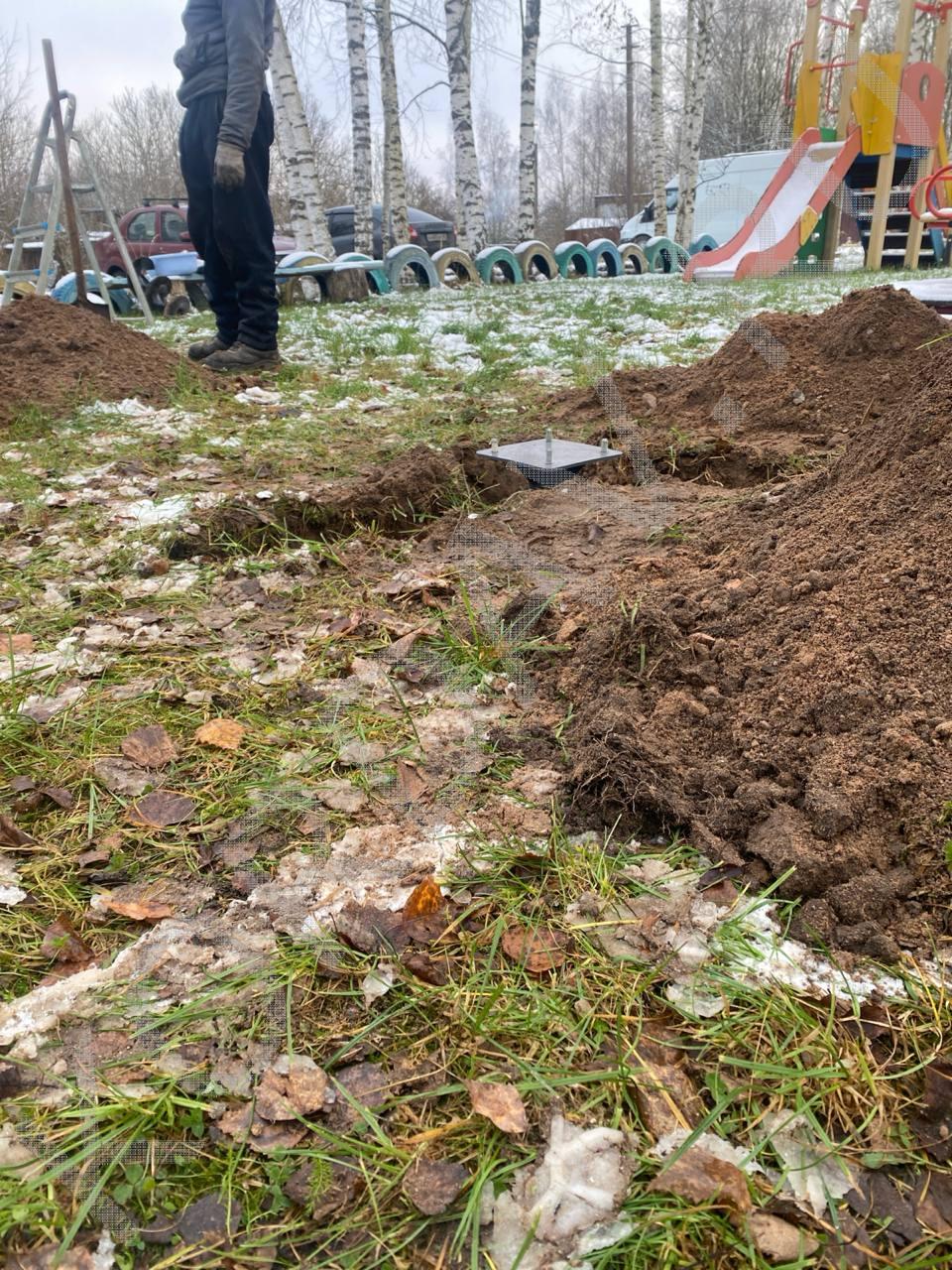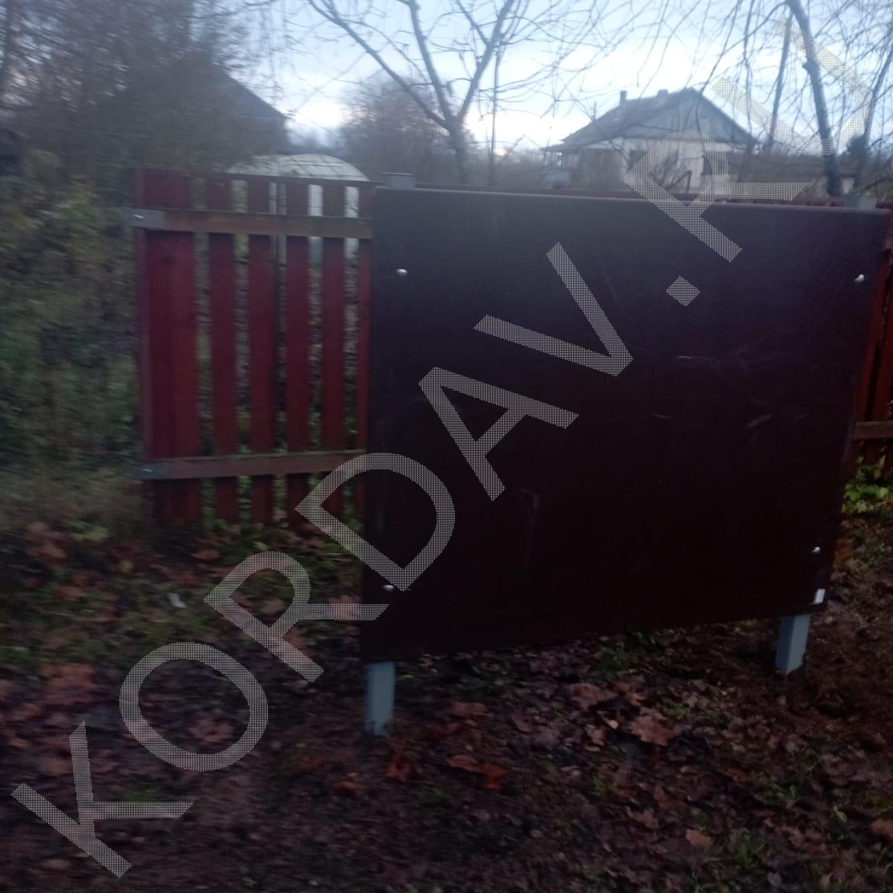 Детская площадка с резиновой плиткой и металлическим ограждением. Использовалось оборудование: